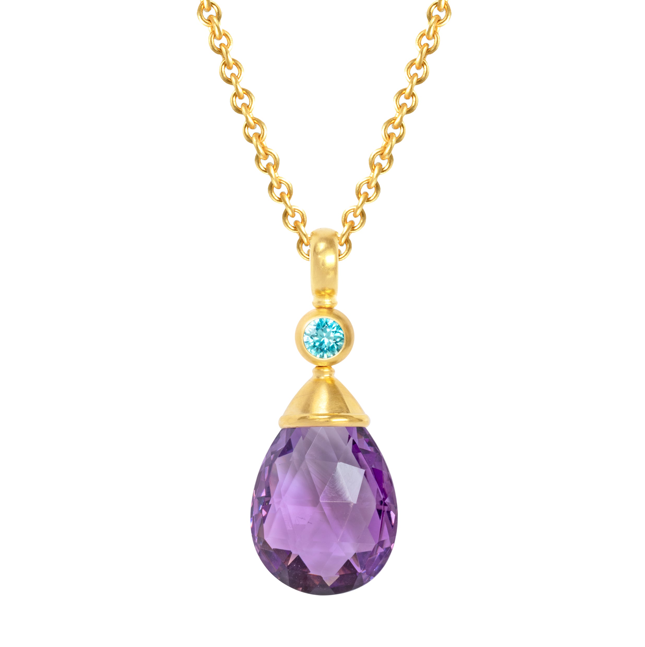 Der facettiert geschliffene Amethyst Tropfen kommt in der freischwebenden Fassung besonders zur Geltung. Der türkisfarbene Starlit ist ein weiteres liebvolles Detail.