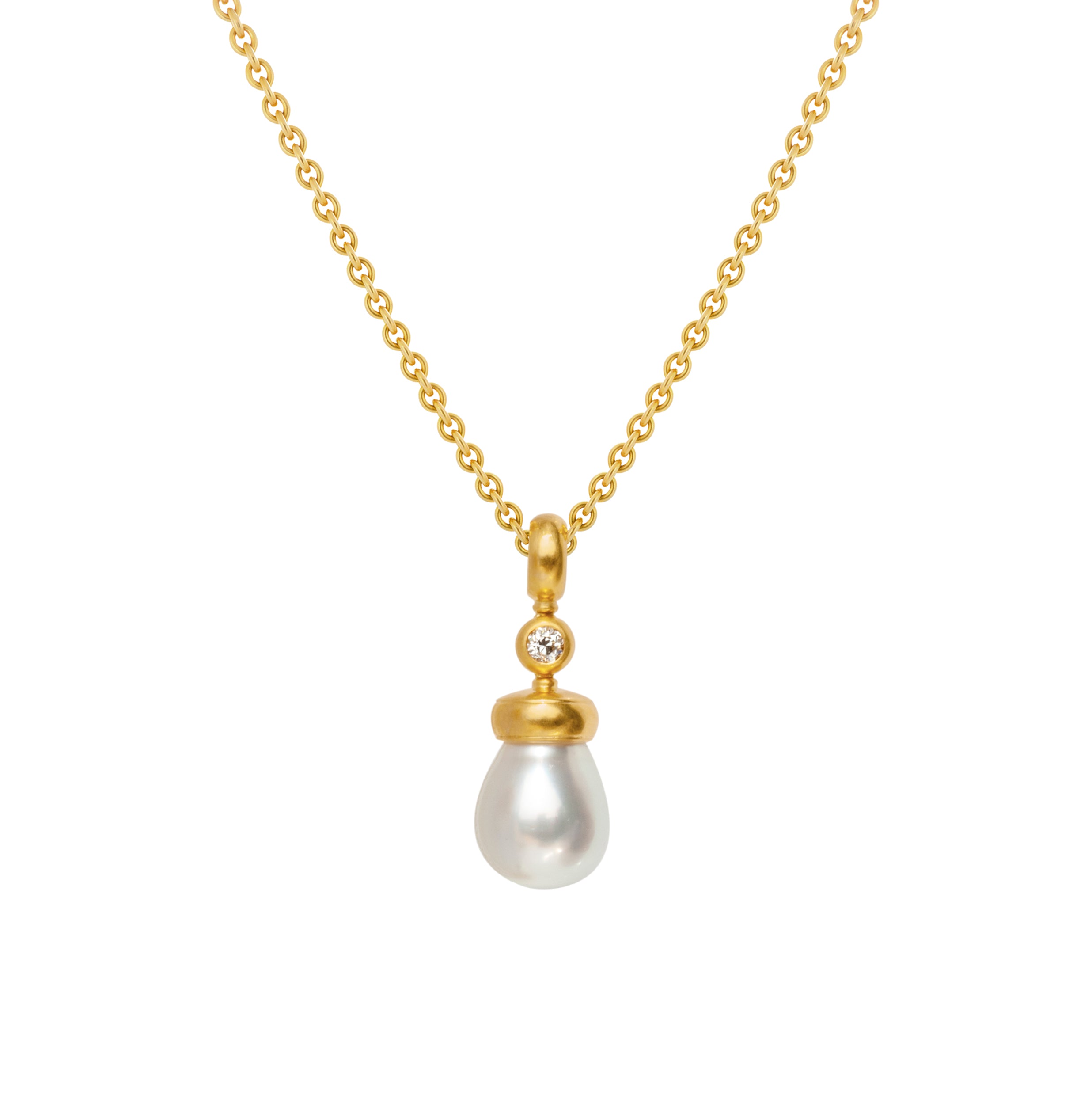 Der Brillant verbindet die schimmernde Südseeperle spielerisch mit der goldenen Fassung.