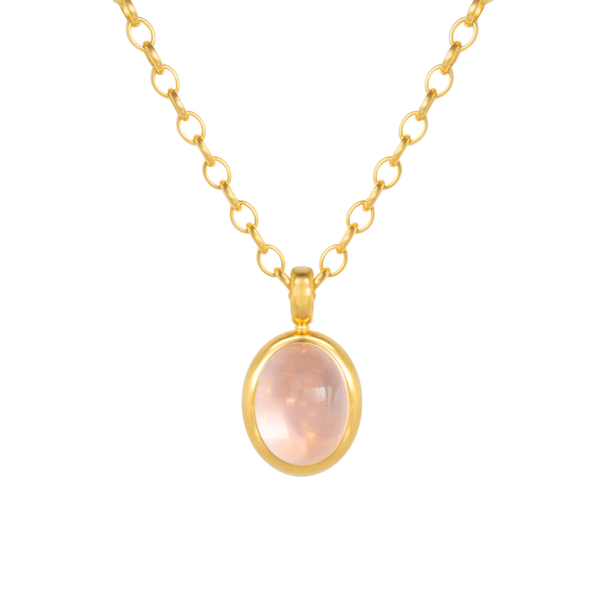 Die schlichte Fassung betont die Schönheit des zart schimmernden Rosenquarzes.