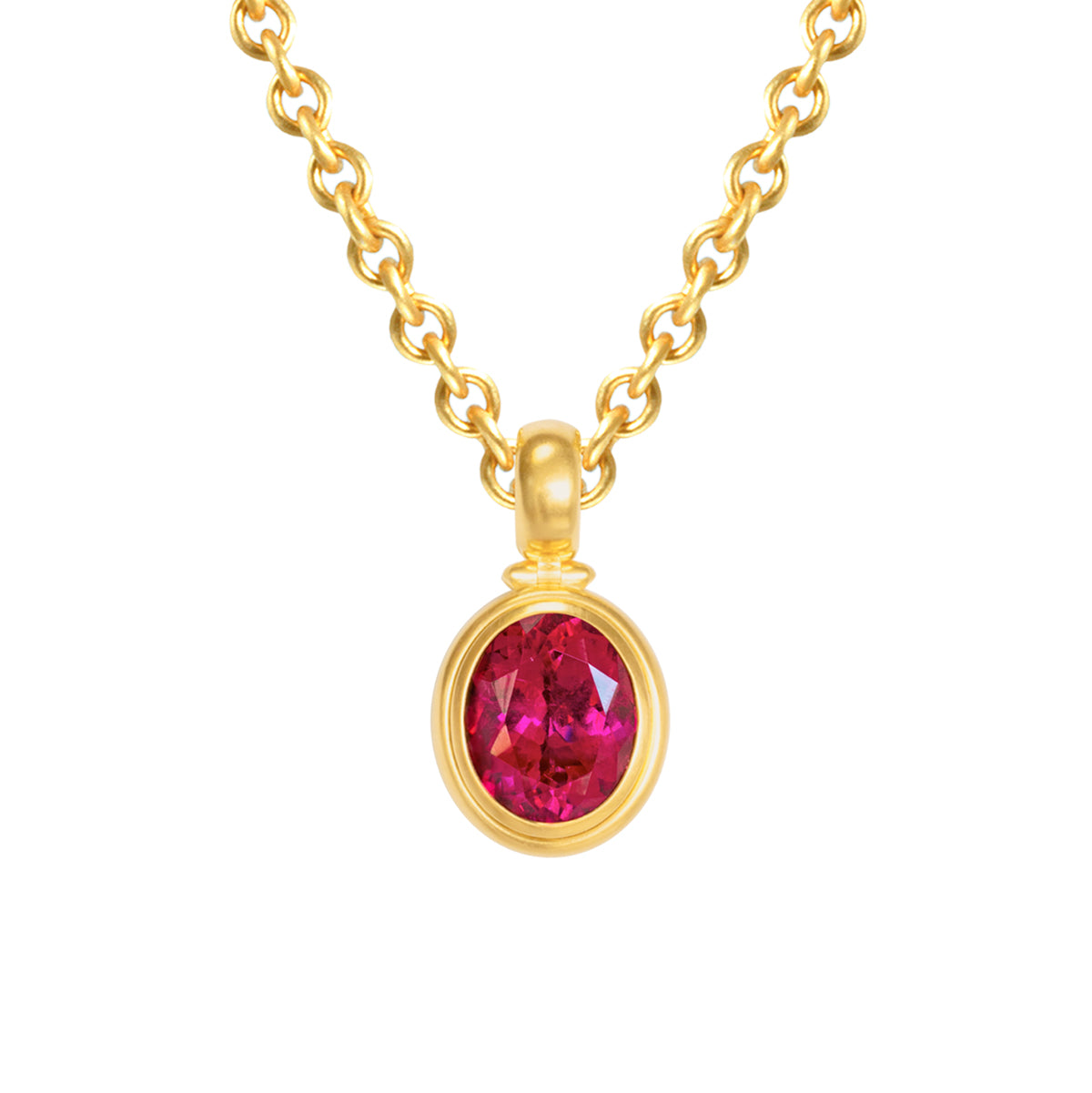 Die raffiniert gestufte Fassung setzt den roten Turmalin im Facettenschliff ins richtige Licht. Die bewegliche Öse lässt das Schmuckstück perfekt anliegen.