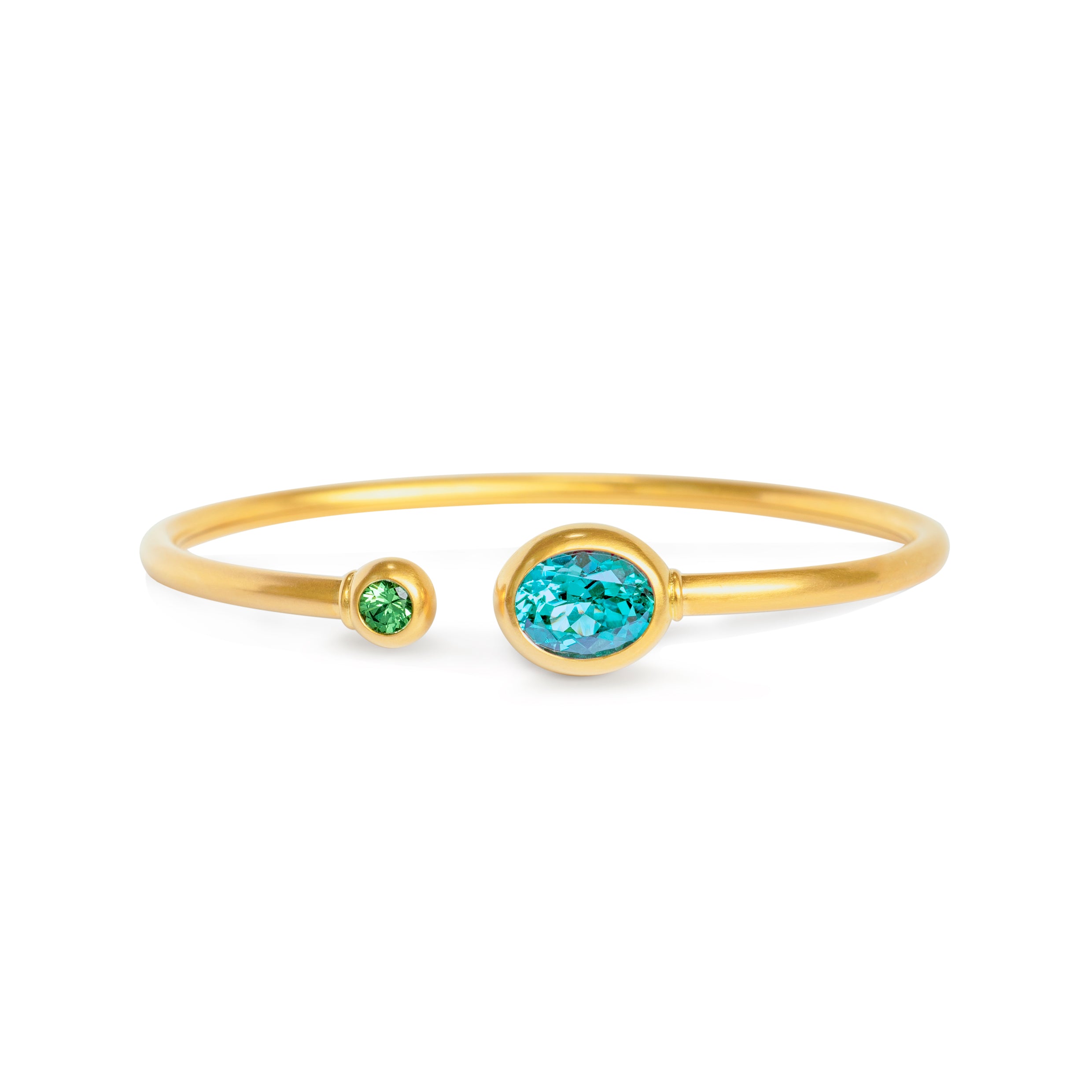 Kunstvoll gefertigte Armspange aus 750 Gelbgold mit einem türkisblauen Starlit und einem Tsavorit im Brillantschliff. Die biegsame Form passt sich perfekt an Ihr Handgelenk an und sorgt für einen angenehmen Tragekomfort.