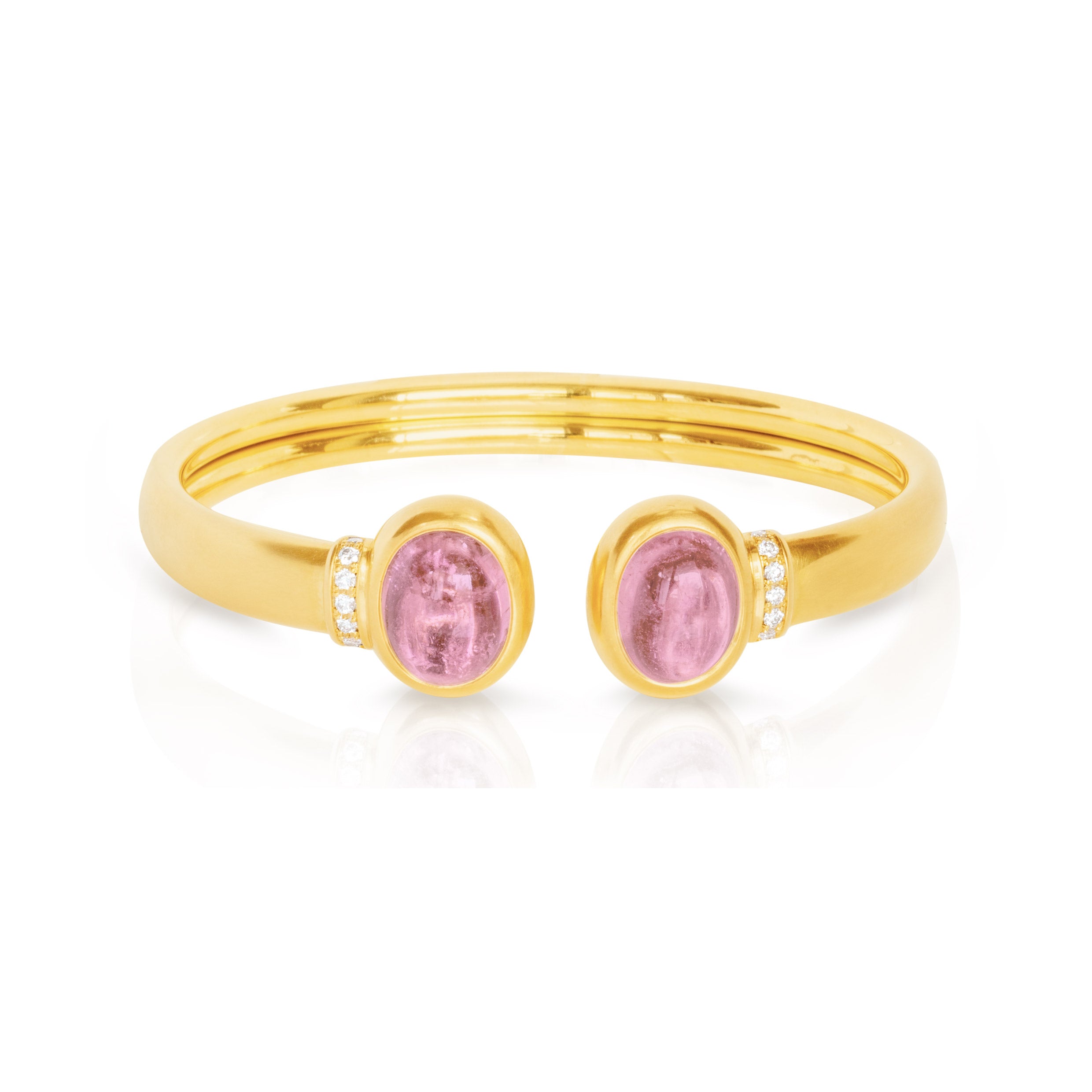 Kunstvoll gefertigte Armspange aus 750 Gelbgold mit seltenen Palaturmalinen im Cabochonschliff und feurigen Brillanten. Die biegsame Form passt sich perfekt an Ihr Handgelenk an und sorgt für einen angenehmen Tragekomfort.