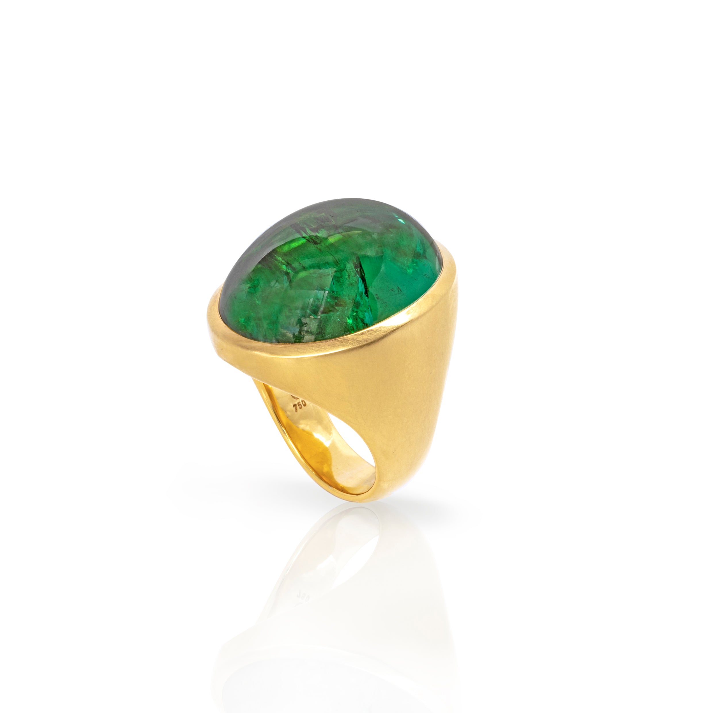 Die Ringschiene ist seitlich schmal und gewährleistet ein angenehmes Tragegefühl. Ein üppiger Goldrausch ummantelt den sensationellen Turmalin im Cabochon Schliff.