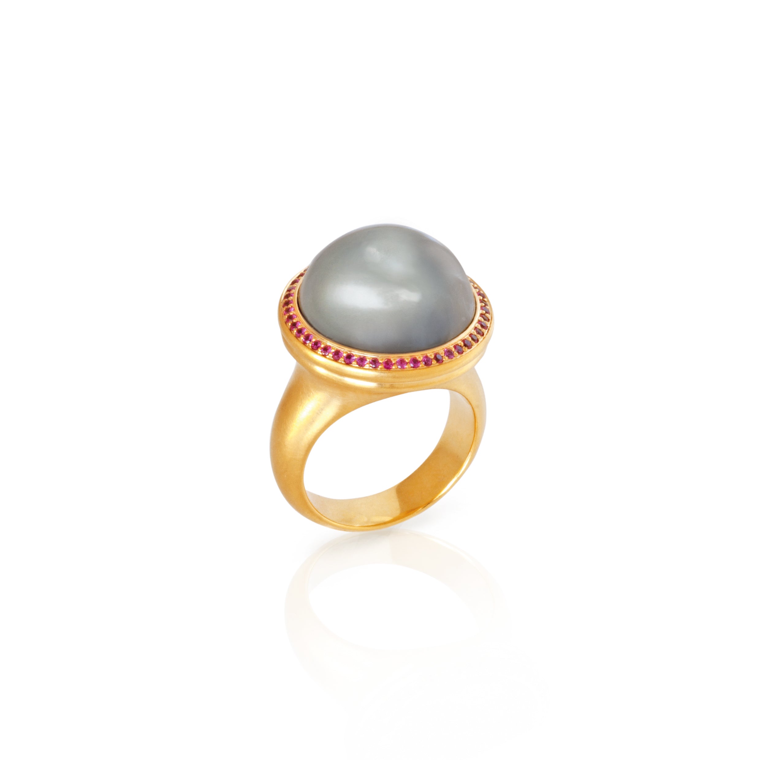 Stones: grauer Mondstein Cabochon 16,15 ct Ø 16 mm rund und 42 pink Saphire Ø 1,2 mm