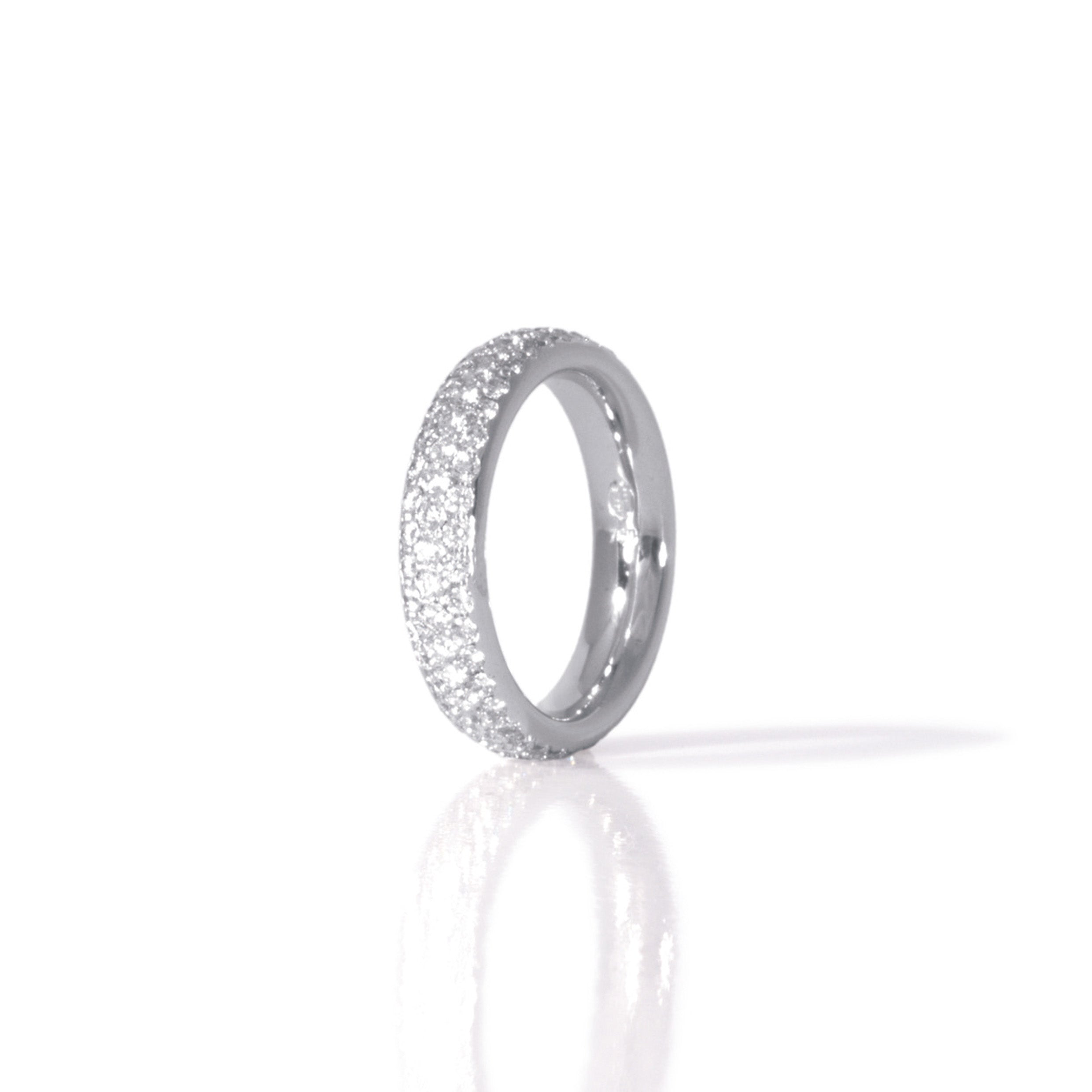 Dieser atemberaubende Ring besticht durch die pavé-gefassten (aus dem Französischen: gepflastert) Edelsteine.