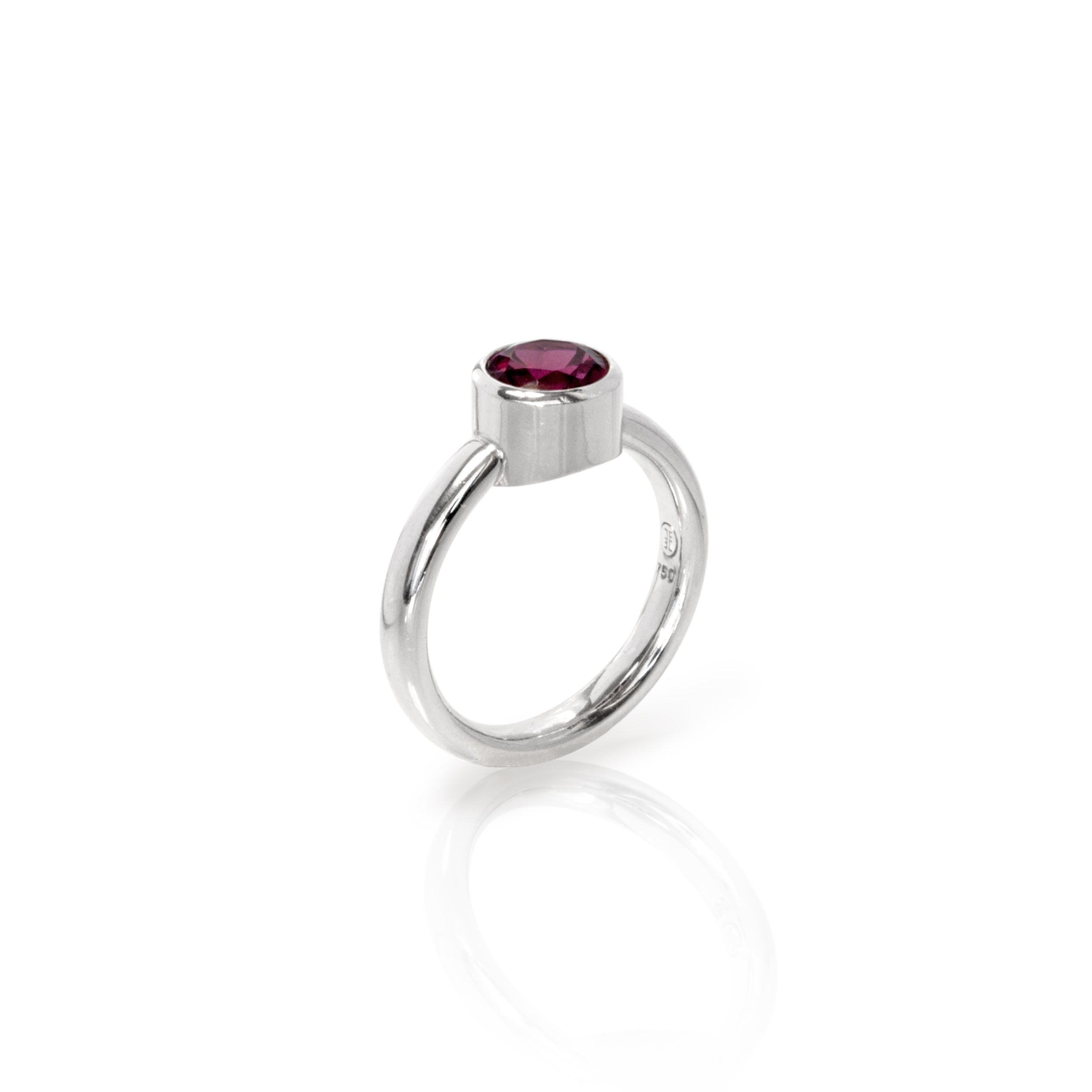 Die zylinderförmige Fassung konzentriert die Symmetrie mit dem schlichten Goldreif des Ringes. Der runde Rhodolith im Facettenschliff unterstreicht die kraftvolle Ausstrahlung.