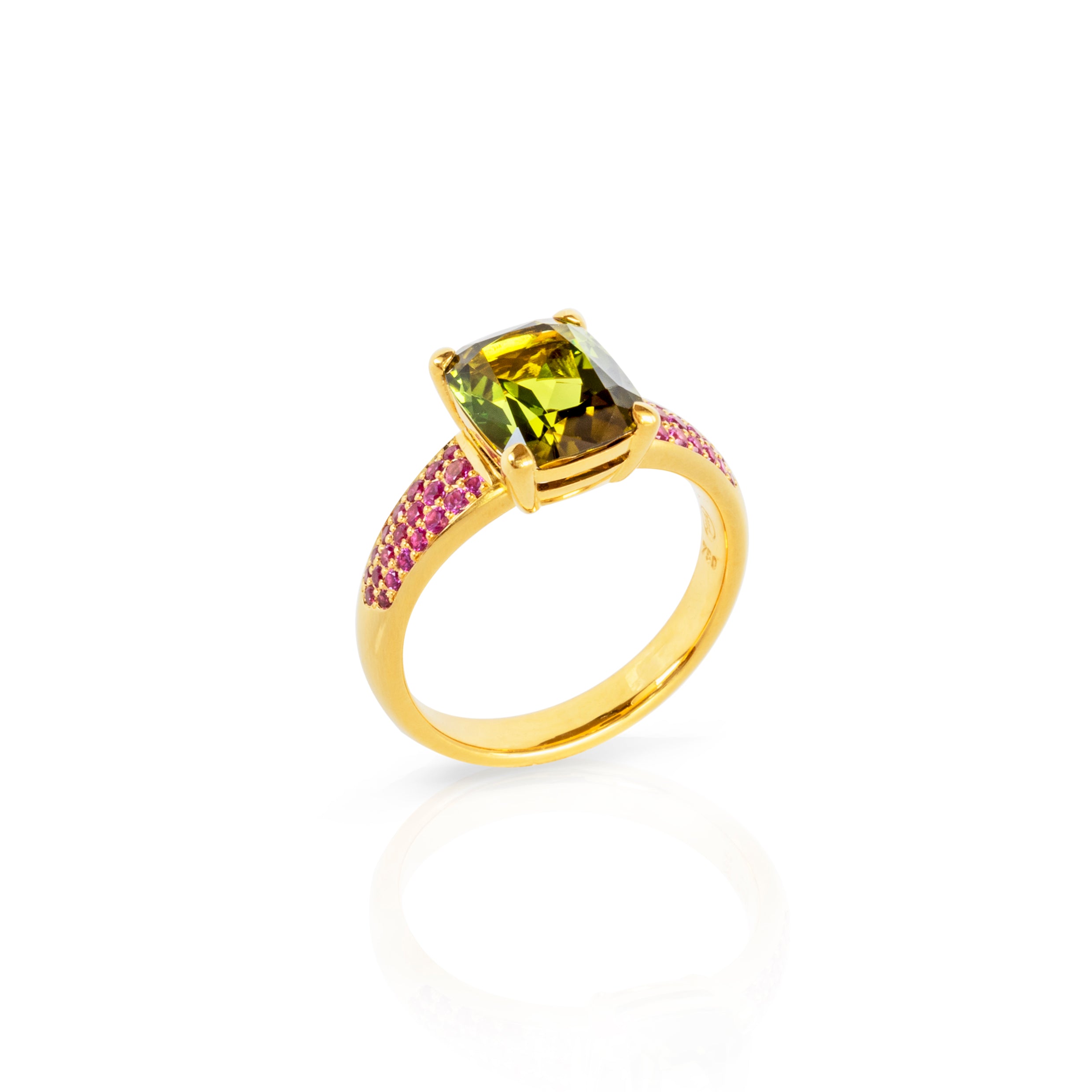 Der strahlende Turmalin im Baguette Schliff ziert den Mittelpunkt dieses Ringes aus 750 Gelbgold.