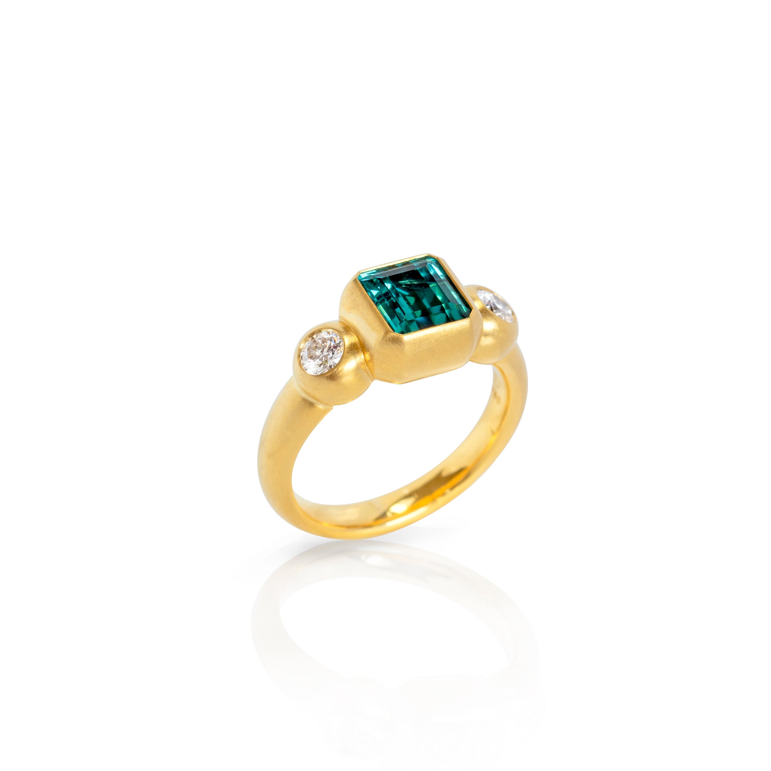 Die Symbiose zwischen dem achteckigen leuchtend grünen Turmalin und den Brillanten, die seitlich an der Ringschiene angebracht sind, vermitteln den Reiz dieses Ringes.