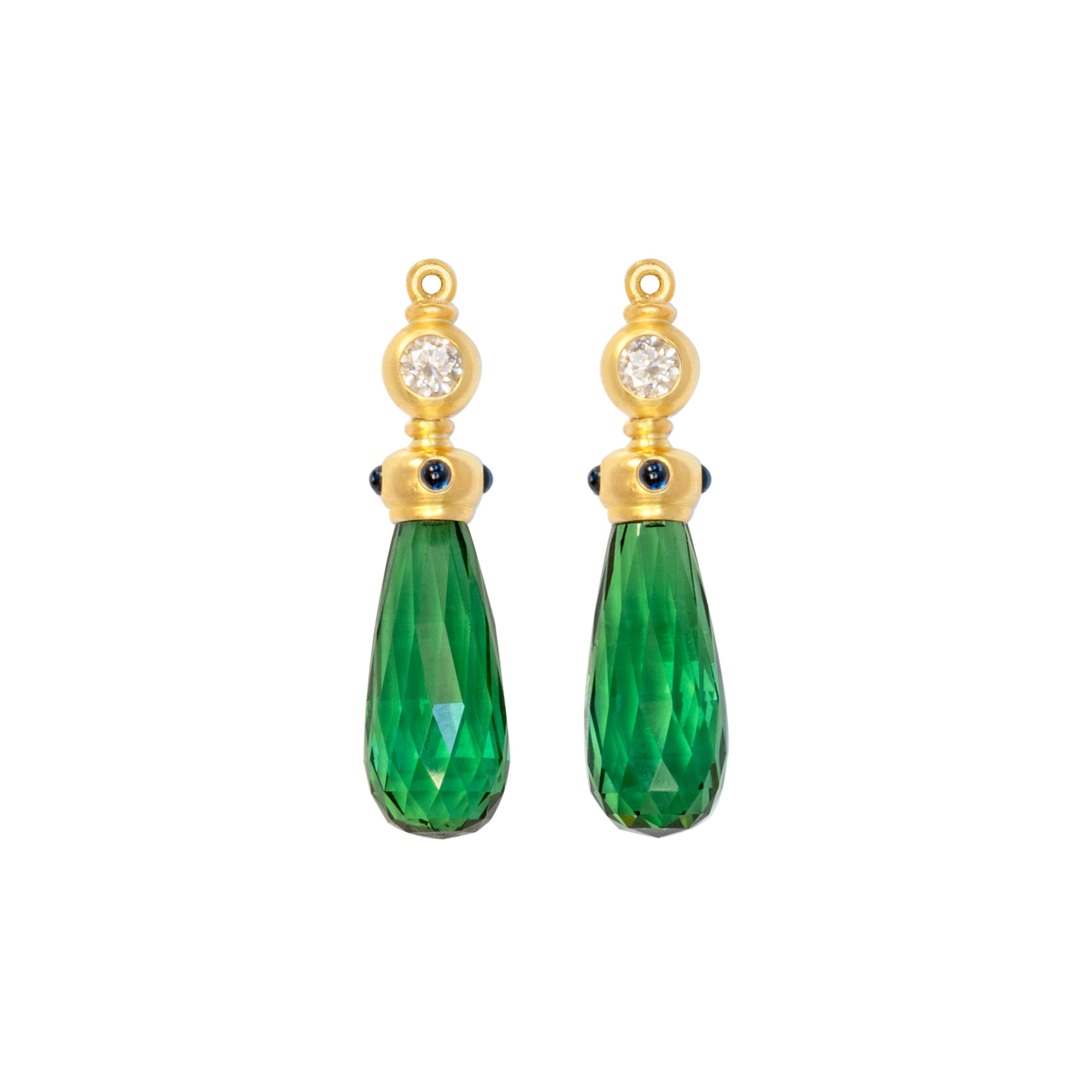 Stones: 2 Brillanten Ø 3,0 mm = 0,20 ct tw vsi, 8 Saphircabochons Ø 1,5 mm und 12,21 ct Turmalinpampeln facettiert 17 x 6,8 mm