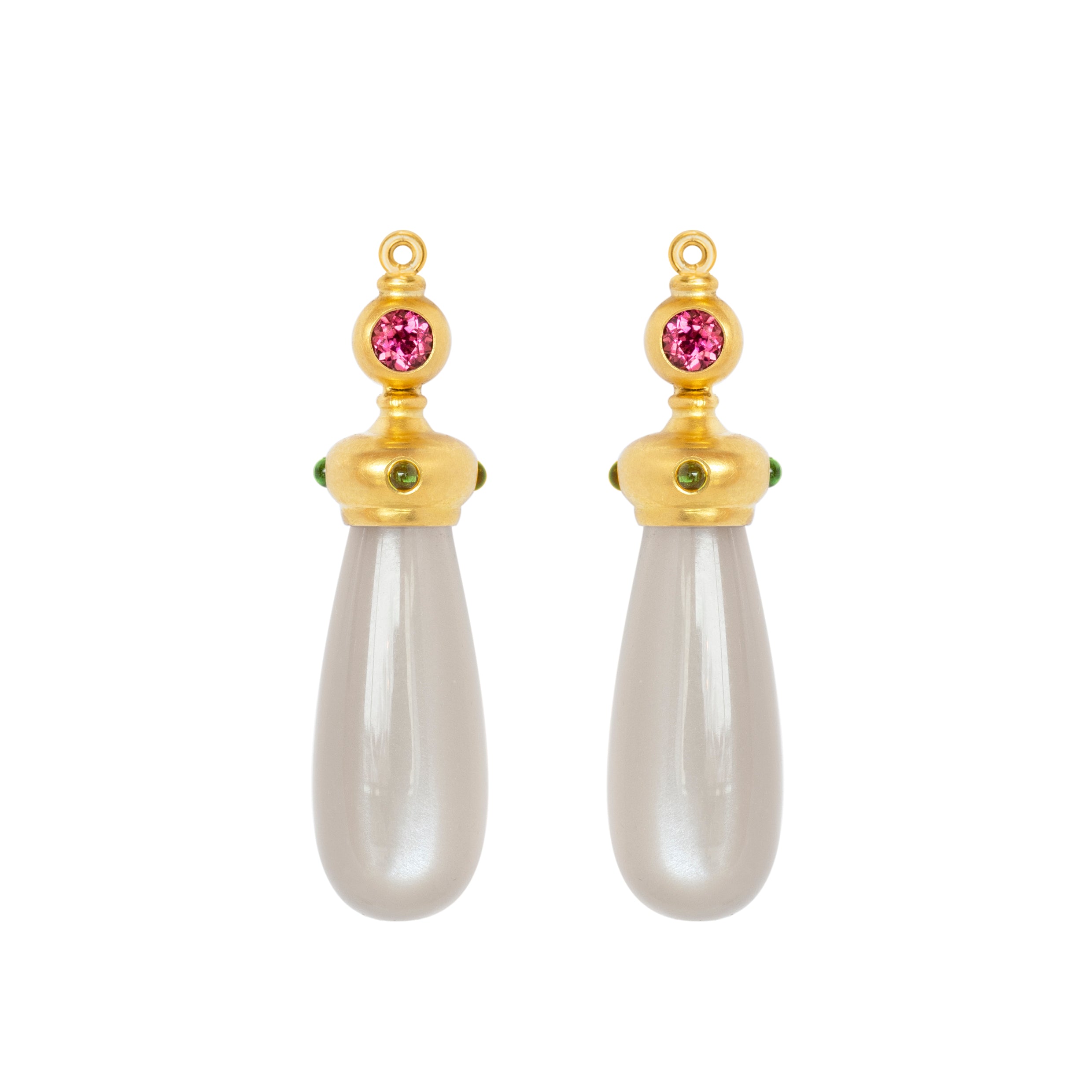 Stones: 2 Rubine 0,24 ct Ø 2,9 mm rund facettiert mit 8 Chromturmalin Cabochons Ø 1,5 mm und grauen Mondstein Pampeln 21 x 8 mm