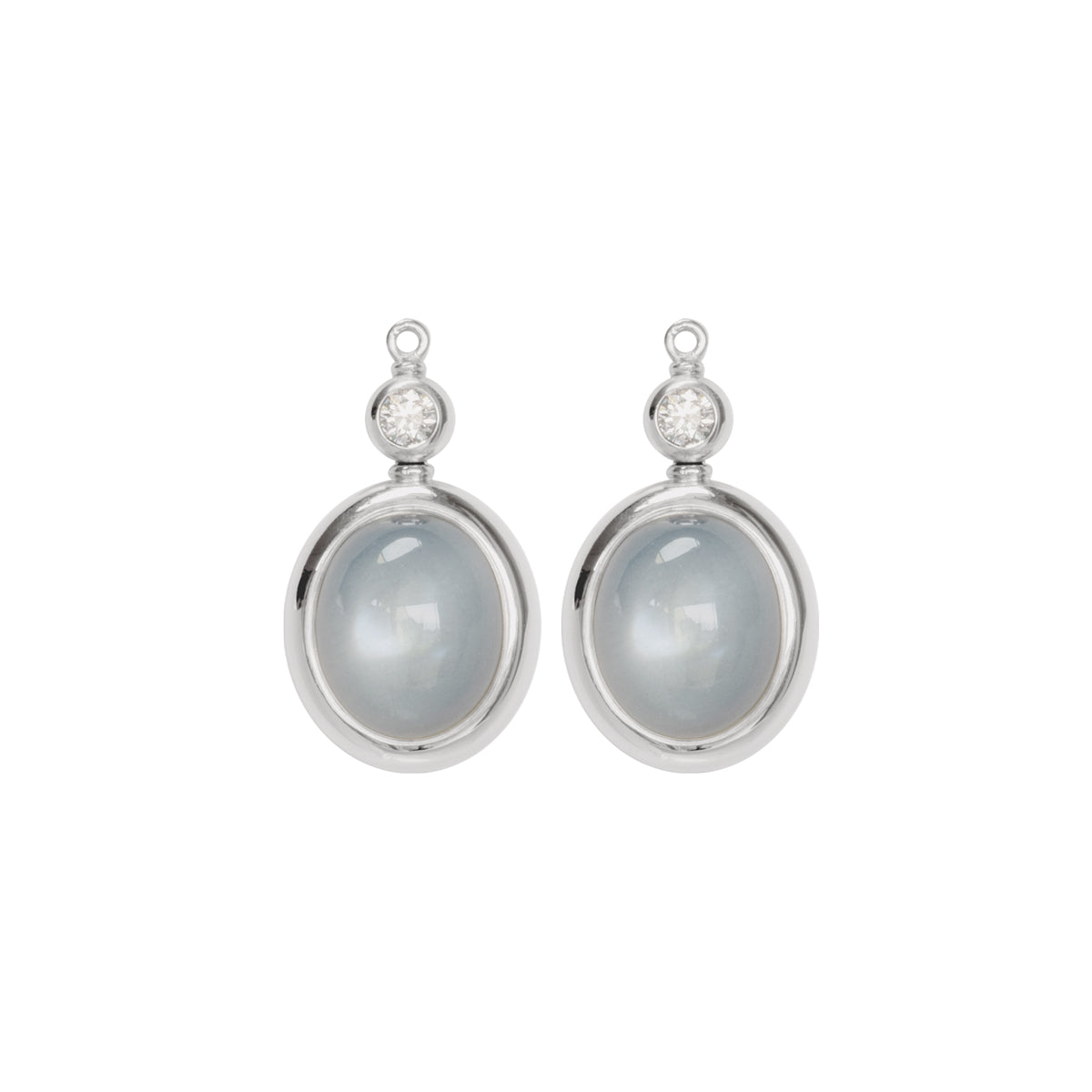 Mit diesen Einhängern aus zarten grauen Mondsteinen und funkelnden Brillanten umrahmt von kühlem Weißgold, lassen sich unsere vielfältigen Oberteile der Vario-Kollektion perfekt kombinieren.