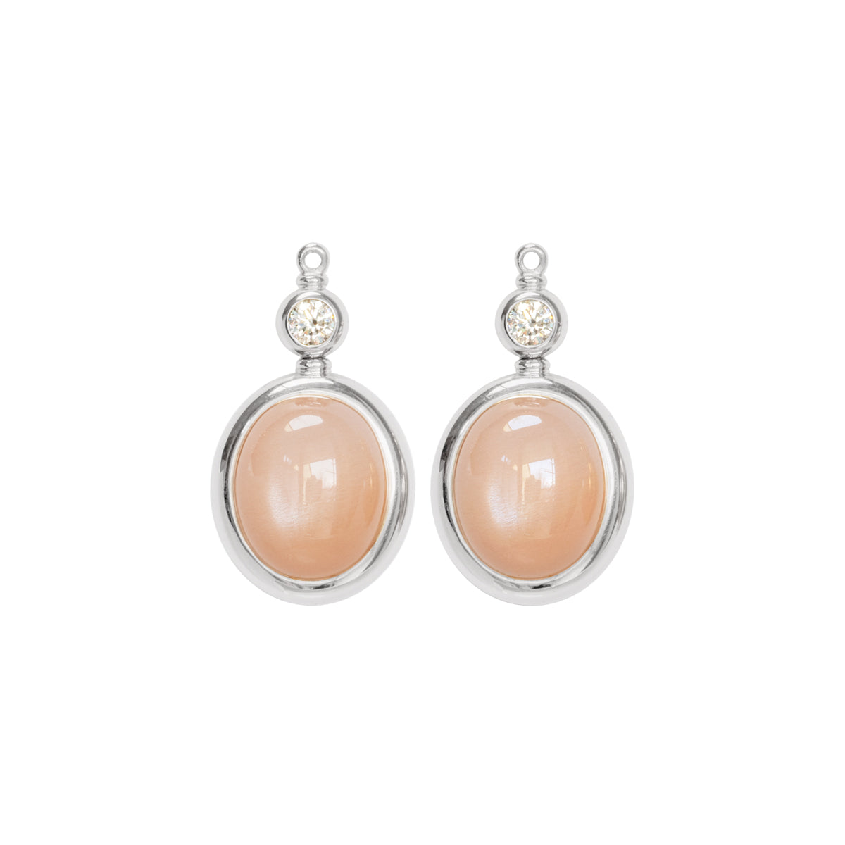 Mit diesen Einhängern aus zarten orangen Mondsteinen und funkelnden Brillanten umrahmt von kühlem Weißgold, lassen sich unsere vielfältigen Oberteile der Vario-Kollektion perfekt kombinieren.