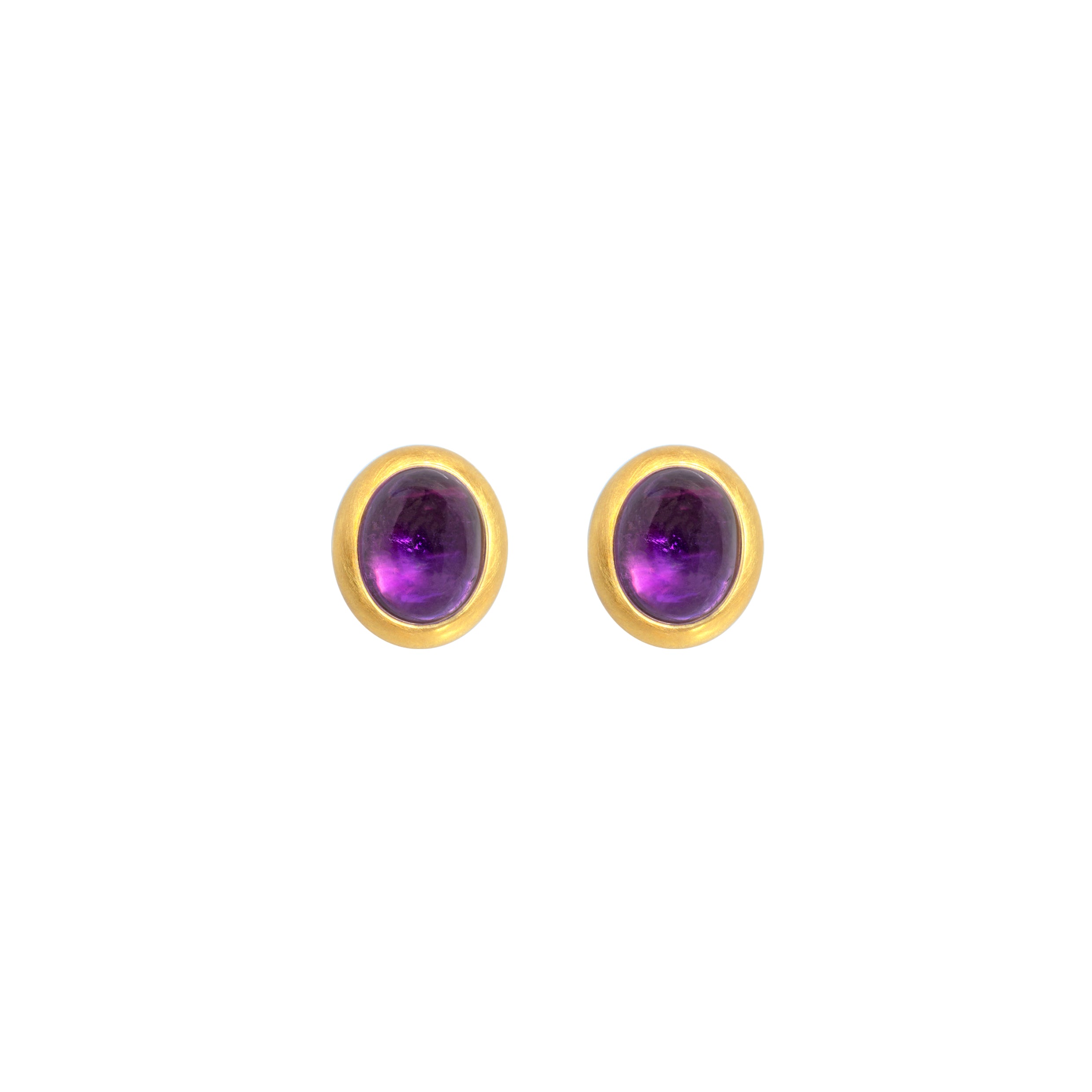 Leuchtende Amethystcabochons, umrandet von einer geschmeidigen Goldfassung. Diese Ohrstecker sind alleine getragen, oder in Kombination mit unseren zahlreichen Einhängern der Vario- Kollektion ein erfrischender Anblick.