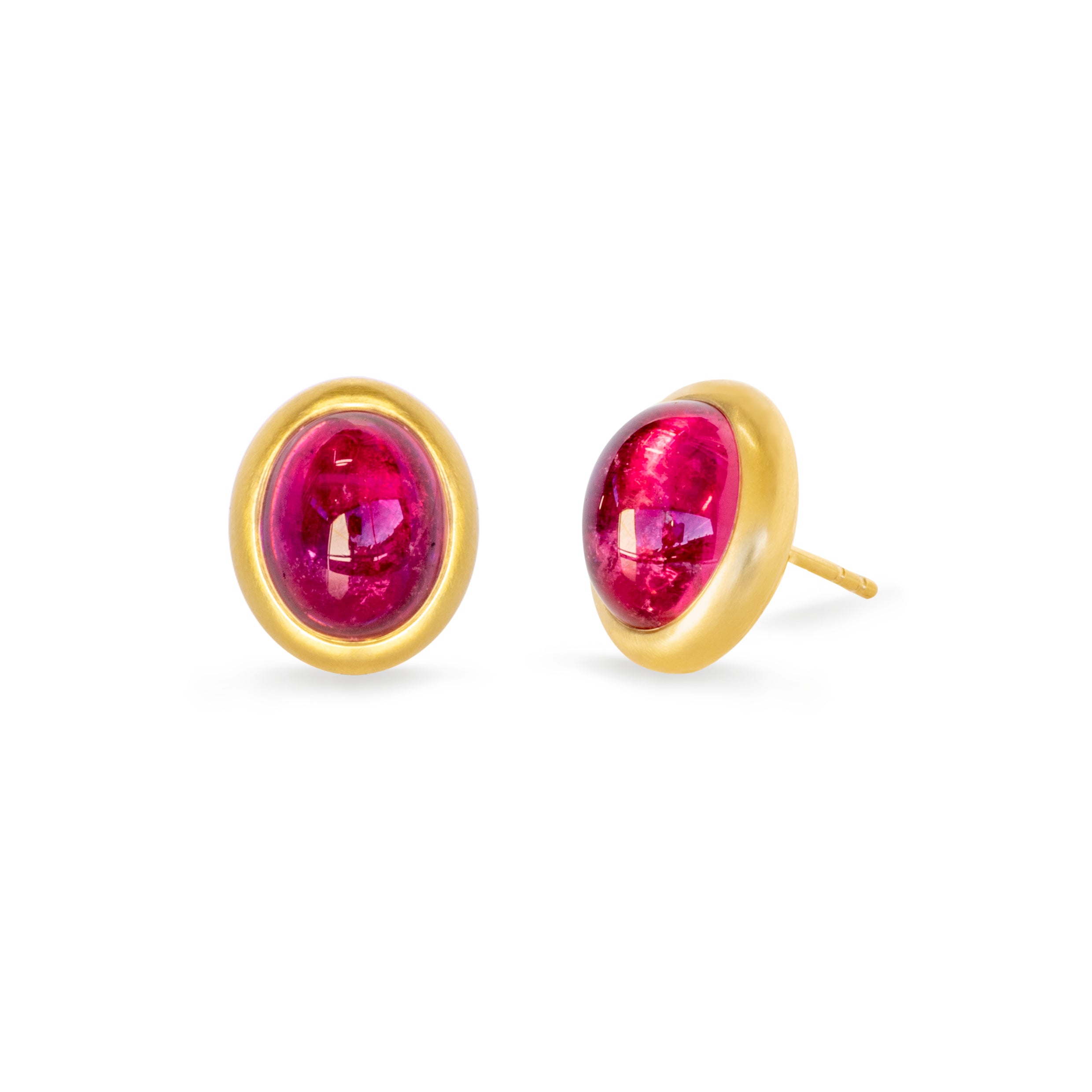Feurige Rubellit Cabochons, umrandet von einer geschmeidigen Goldfassung. Diese Ohrstecker sind alleine getragen, oder in Kombination