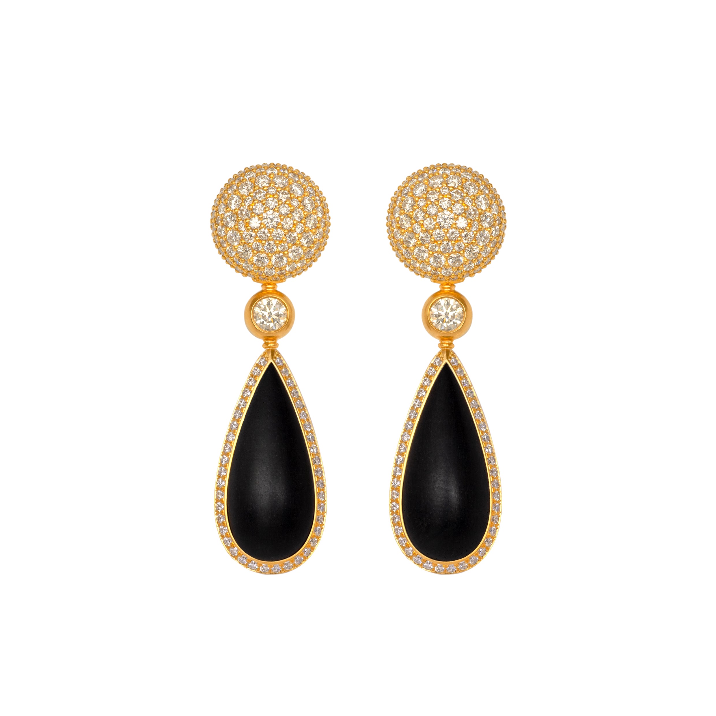 Über 230 Brillanten erzeugen ein wahres Feuerwerk, alleine in den Oberteilen dieses beeindruckenden Ensembles. Die Brillanten im Mittelteil glänzen als Übergang zu den eher schlichten Ebenholztropfen, die von einem zarten Band aus Brillanten umrahmt sind.