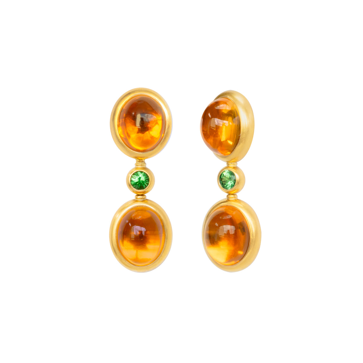 Ein harmonisches Farbspiel zeigen die Ohrringe mit den honigfarbenen Citrinen verbunden durch leuchtend grüne Tsavorite.