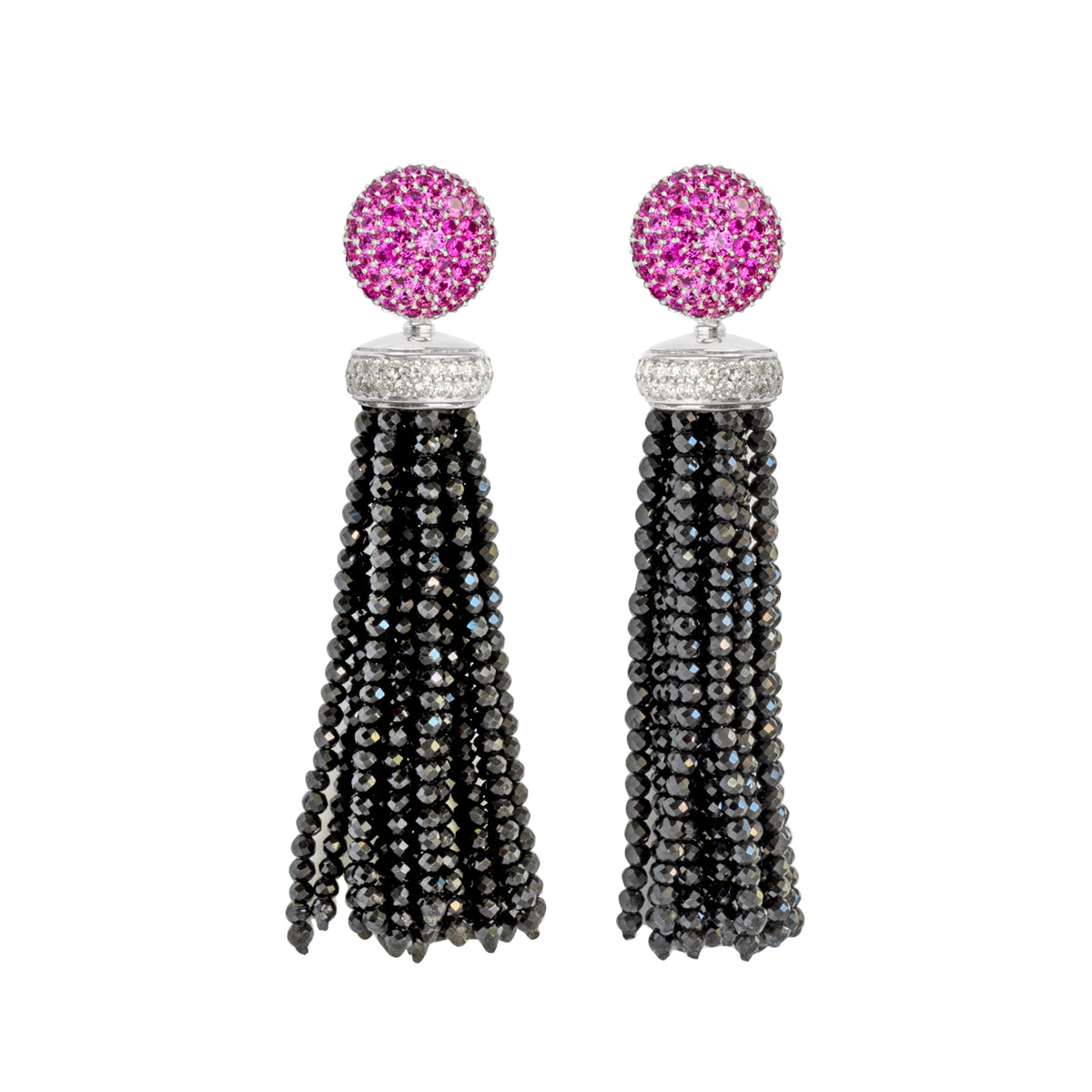 Die mit pinken Saphiren besetzten Oberteile harmonieren perfekt mit den funkelnden, schwarzen Spinellquasten.