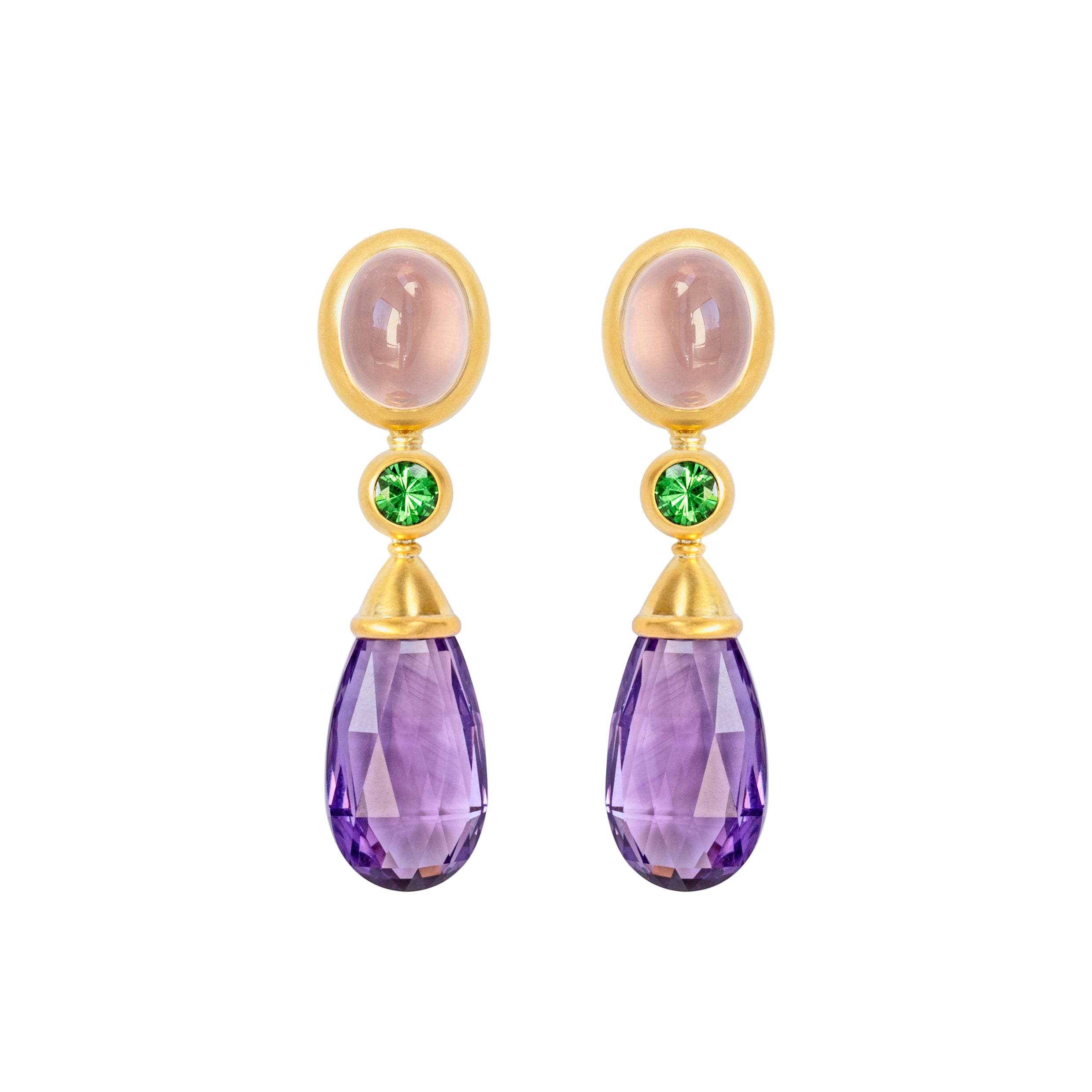Diese Variante kombiniert zarte Rosenquarze mit grünen Tsavoriten und facettierten Amethyst Tropfen.