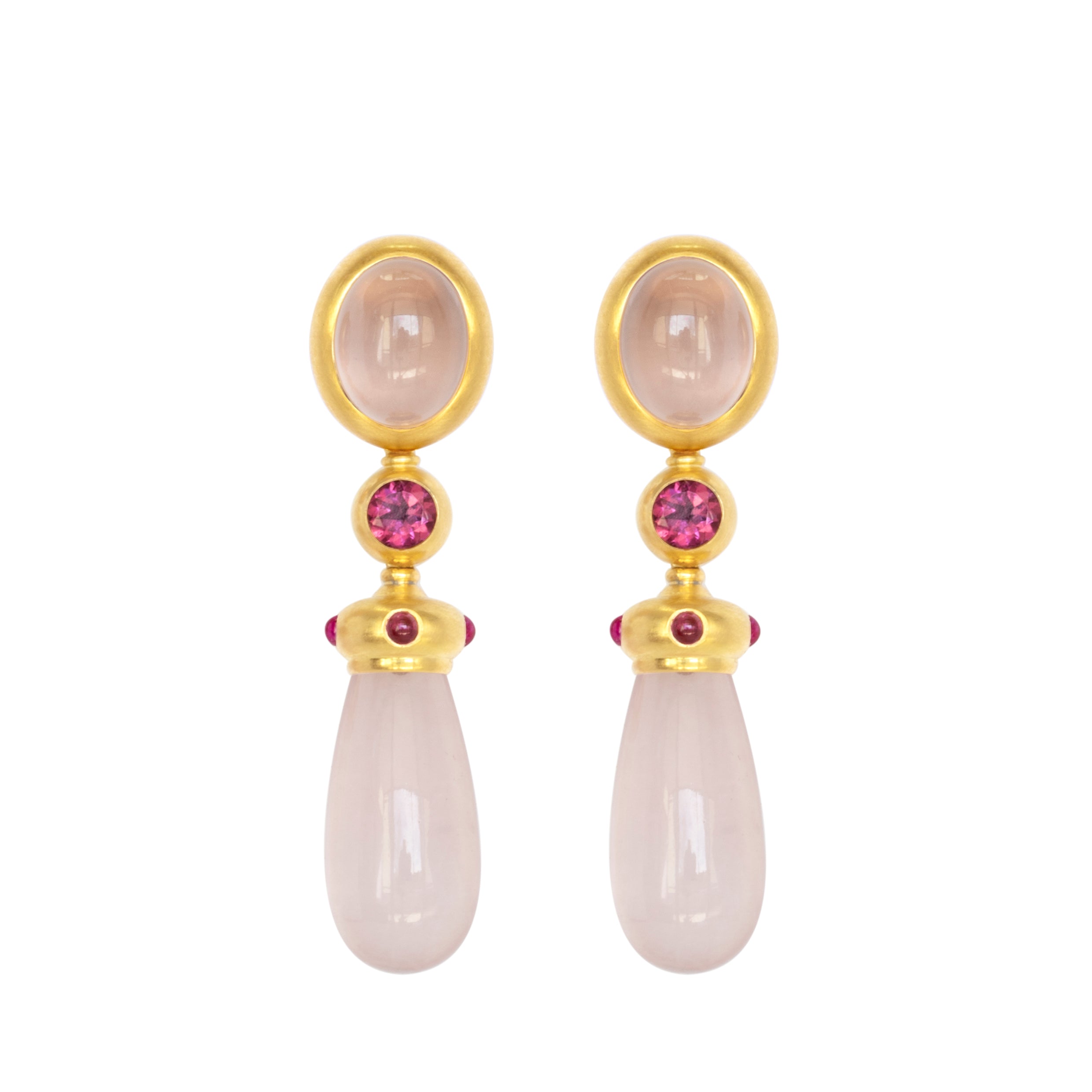 Stones: 2 Rubellite 0,51 ct Ø 4 mm rund facettiert mit 8 pink Saphir Cabochons Ø 1,5 mm und Rosenquarz Pampeln 24,83 ct 22 x 9 mm