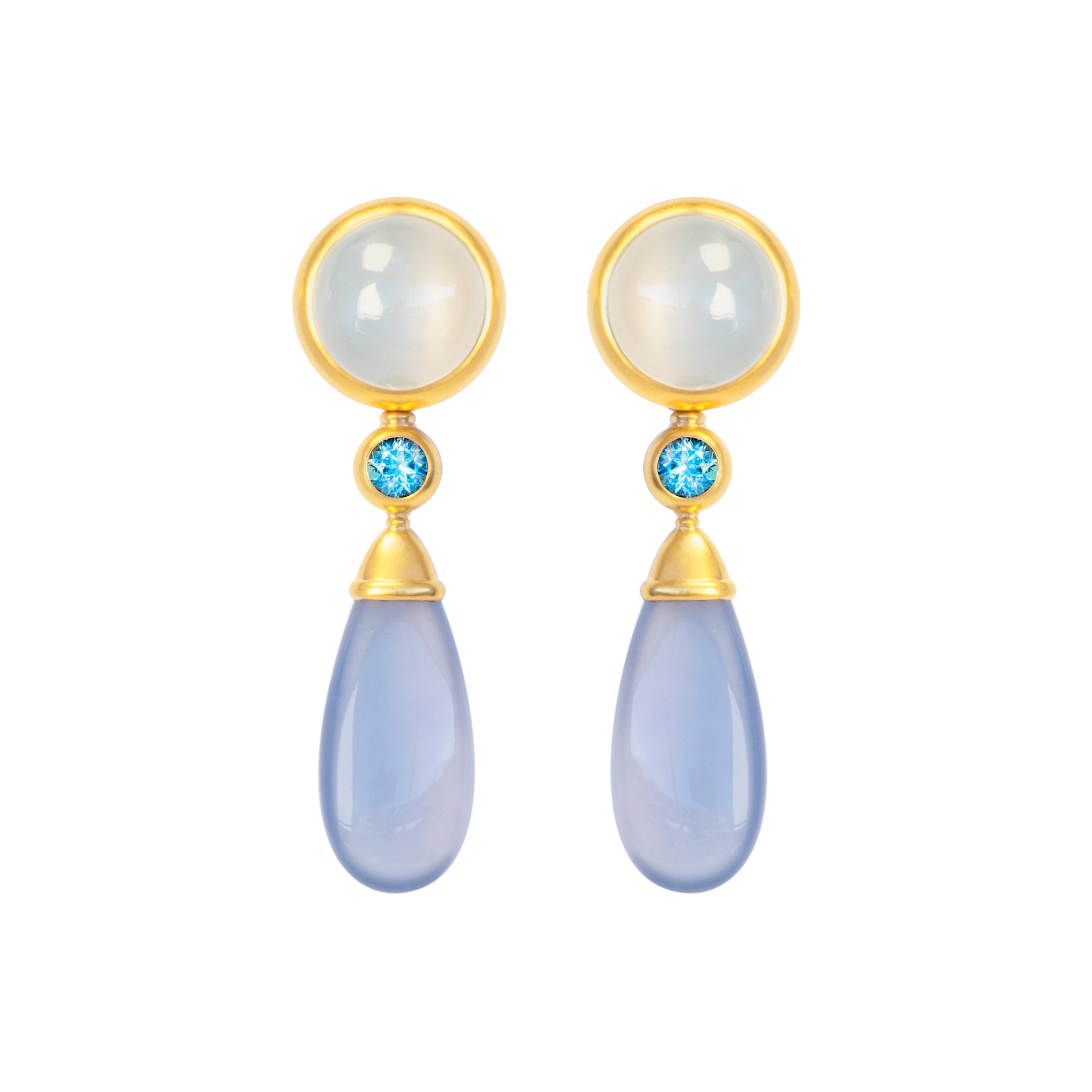 Diese Variante kombiniert zarte Mondstein Ohrstecker mit Aquamarinen im Brillantschliff und Calcedon Pampeln.