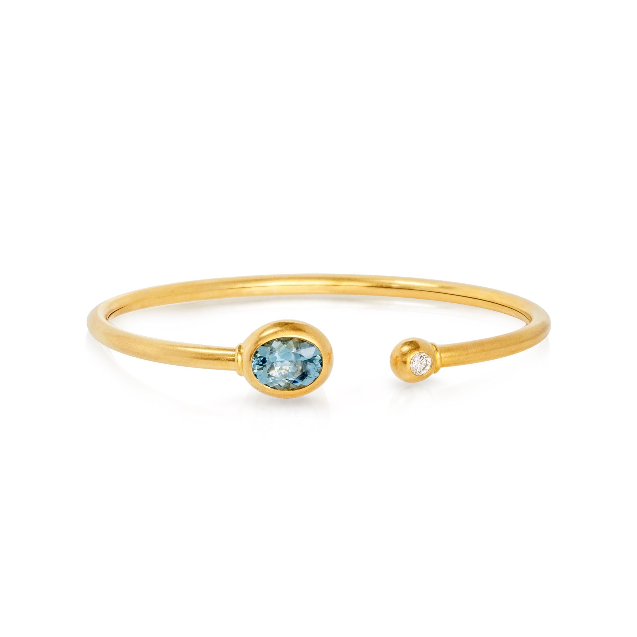 Kunstvoll gefertigte Armspange aus 750 Gelbgold mit einem facettierten Aquamarin und einem feurigen Brillanten. Die biegsame Form passt sich perfekt an Ihr Handgelenk an und sorgt für einen angenehmen Tragekomfort.