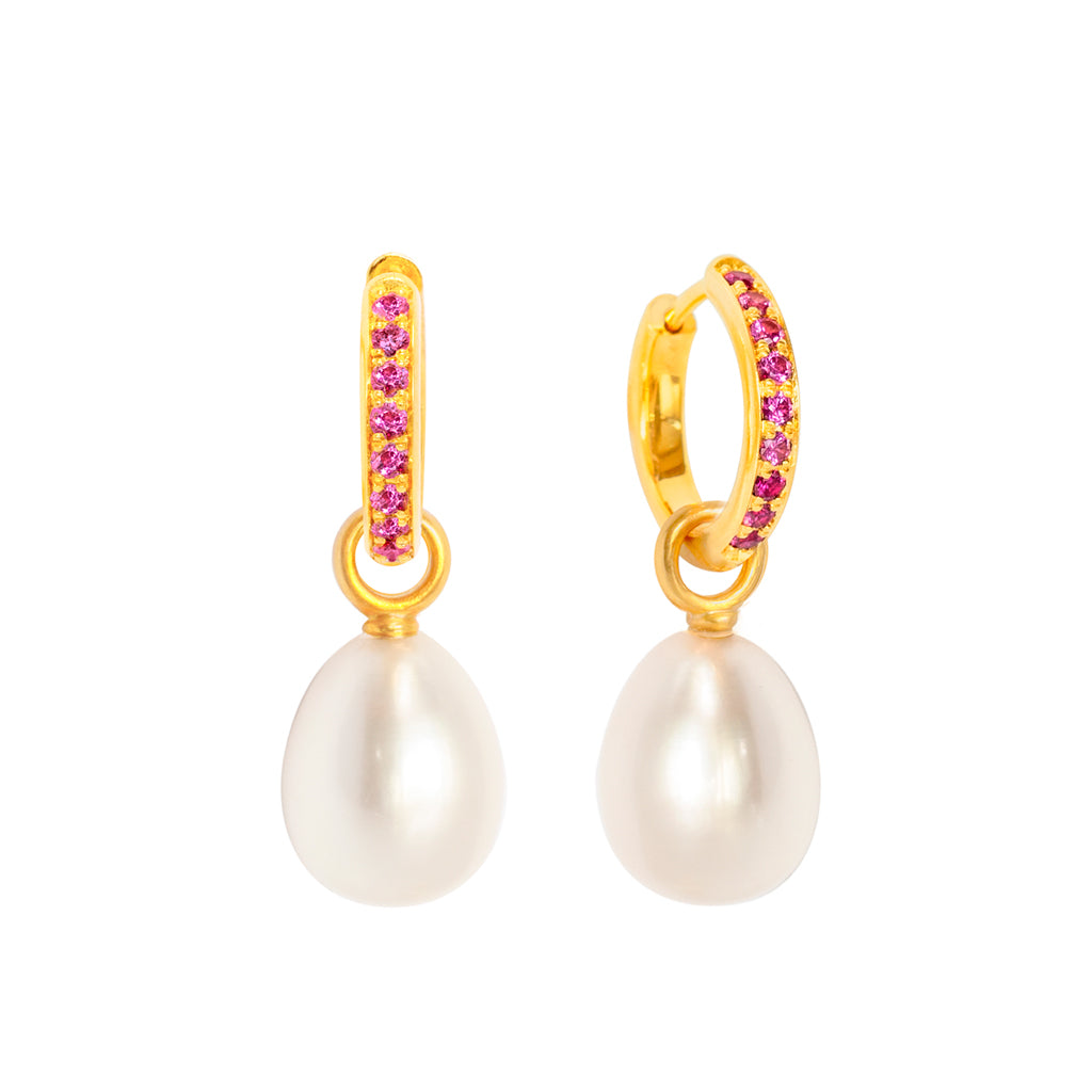 Ohrschmuck Klappcreolen mit pink Saphiren und Perleinhängern