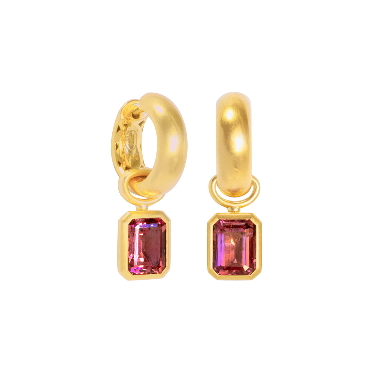 Die wunderbar leuchtenden Rubellite mit diesem außergewöhnlichen Schliff, in der raffinierten Fassung sind eine fantasitsche Ergänzung zu unseren Klappcreolen.