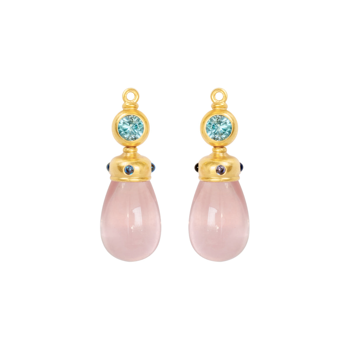 Steine: 2 Starlite 0,78 ct, Ø 4 mm rund facettiert mit 8 blauen Saphir Cabochons Ø 1,5 mm und Rosenquarz Pampeln 16,93 ct 15 x 9 mm ct