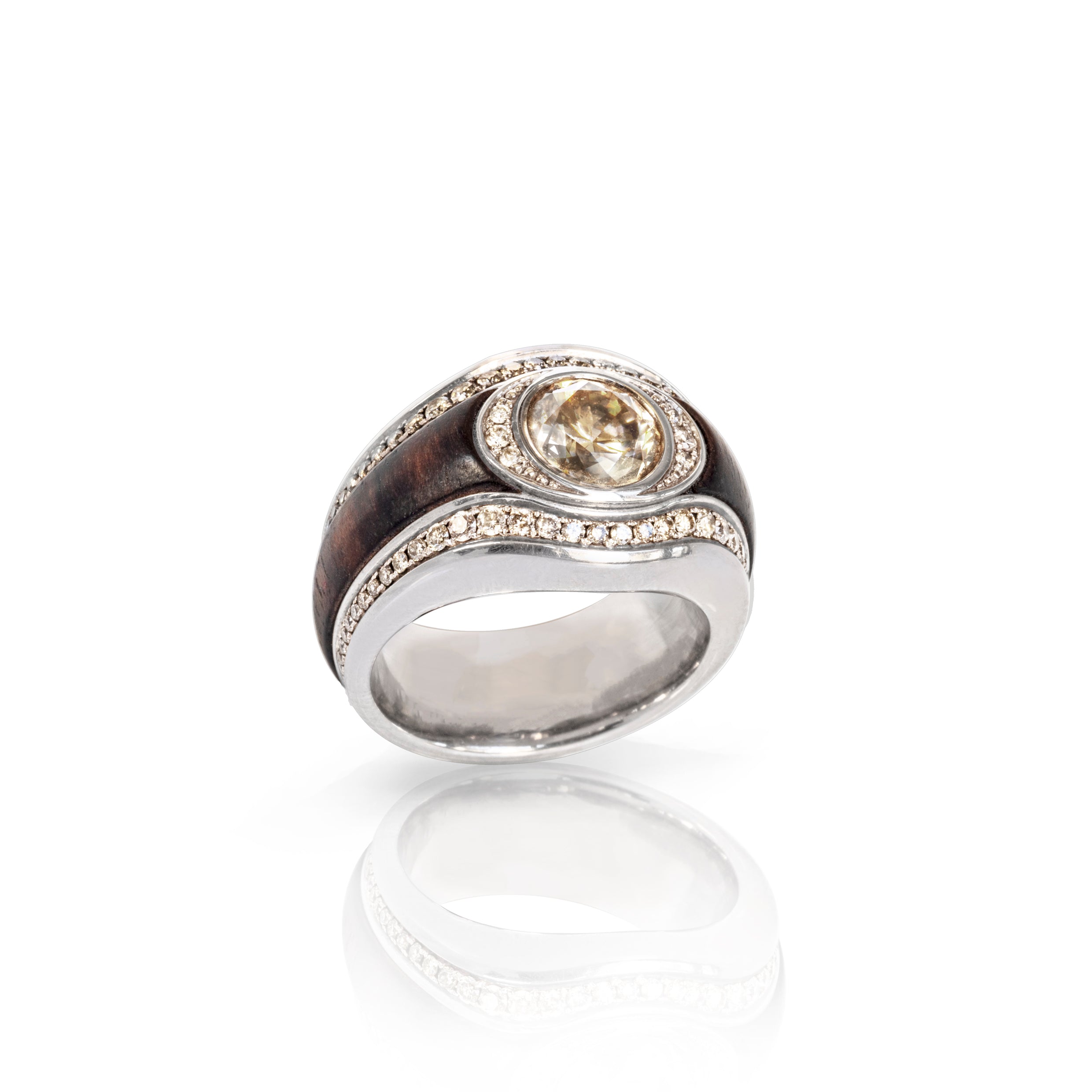 Edles Weißgold trifft auf tiefes Ebenholz – ein spannender Kontrast, der durch funkelnde braune Diamanten vollendet wird. Ein Unikat, das Wärme, Eleganz und Individualität vereint.