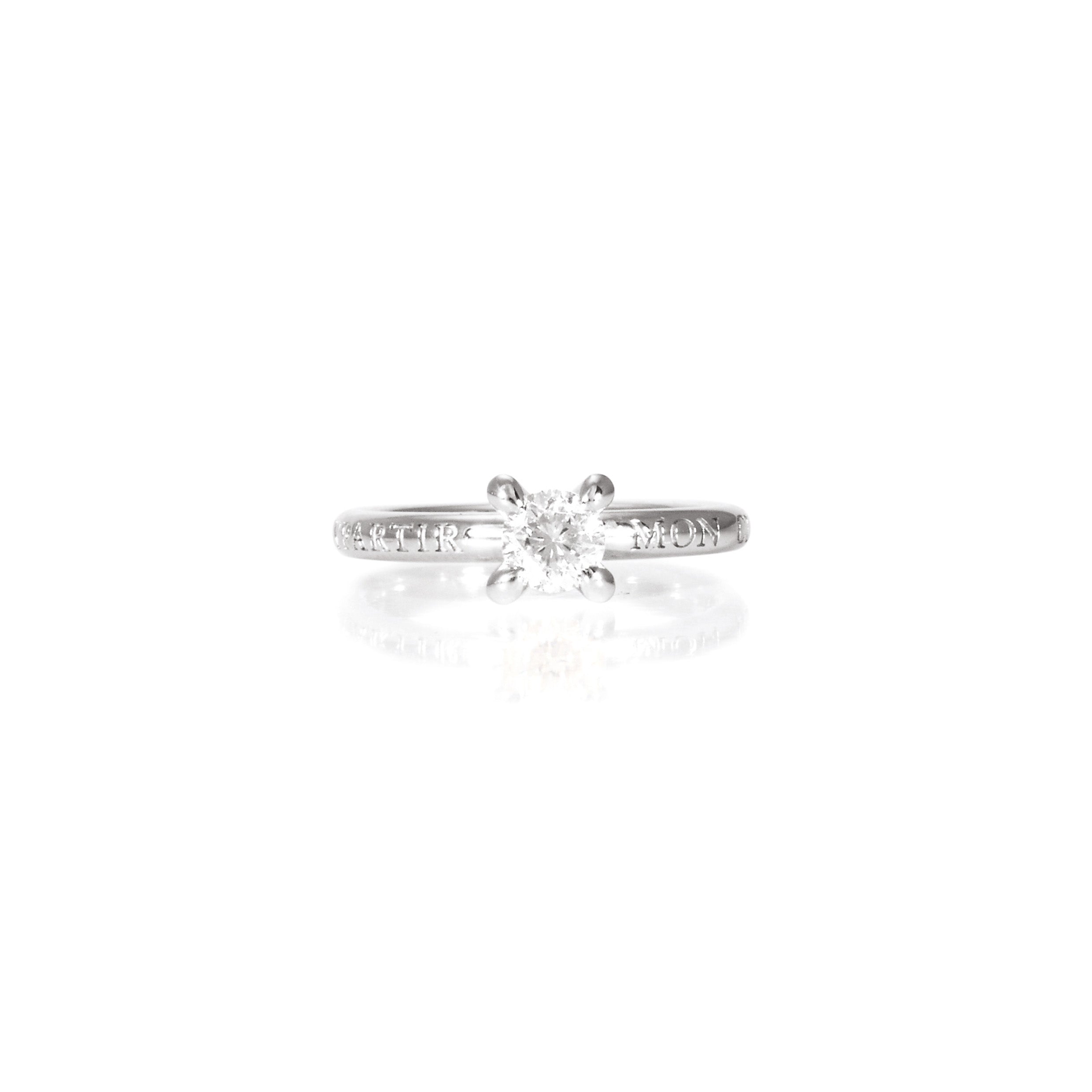 Solitärring 750 Weißgold mit vier Krappen parallel zur Schiene mit Außengravur „mon cuer“
