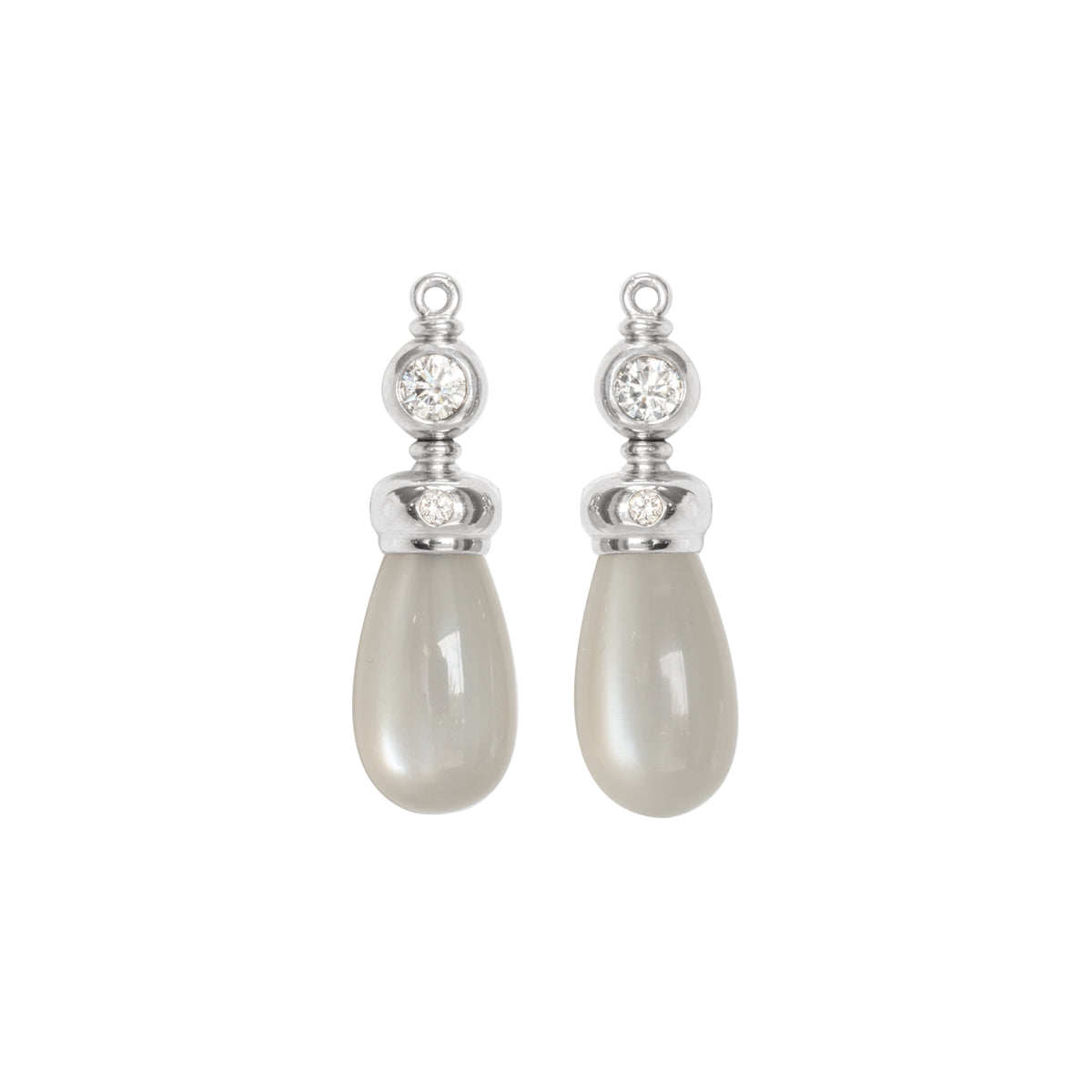 Steine: 2 Brillanten = 0,20 ct tw vsi Ø 3,0 mm, 8 Brill. Ø 1,5 mm = 0,096 ct tw vsi und hellgraue Mondsteinpampeln 14 x 7 mm