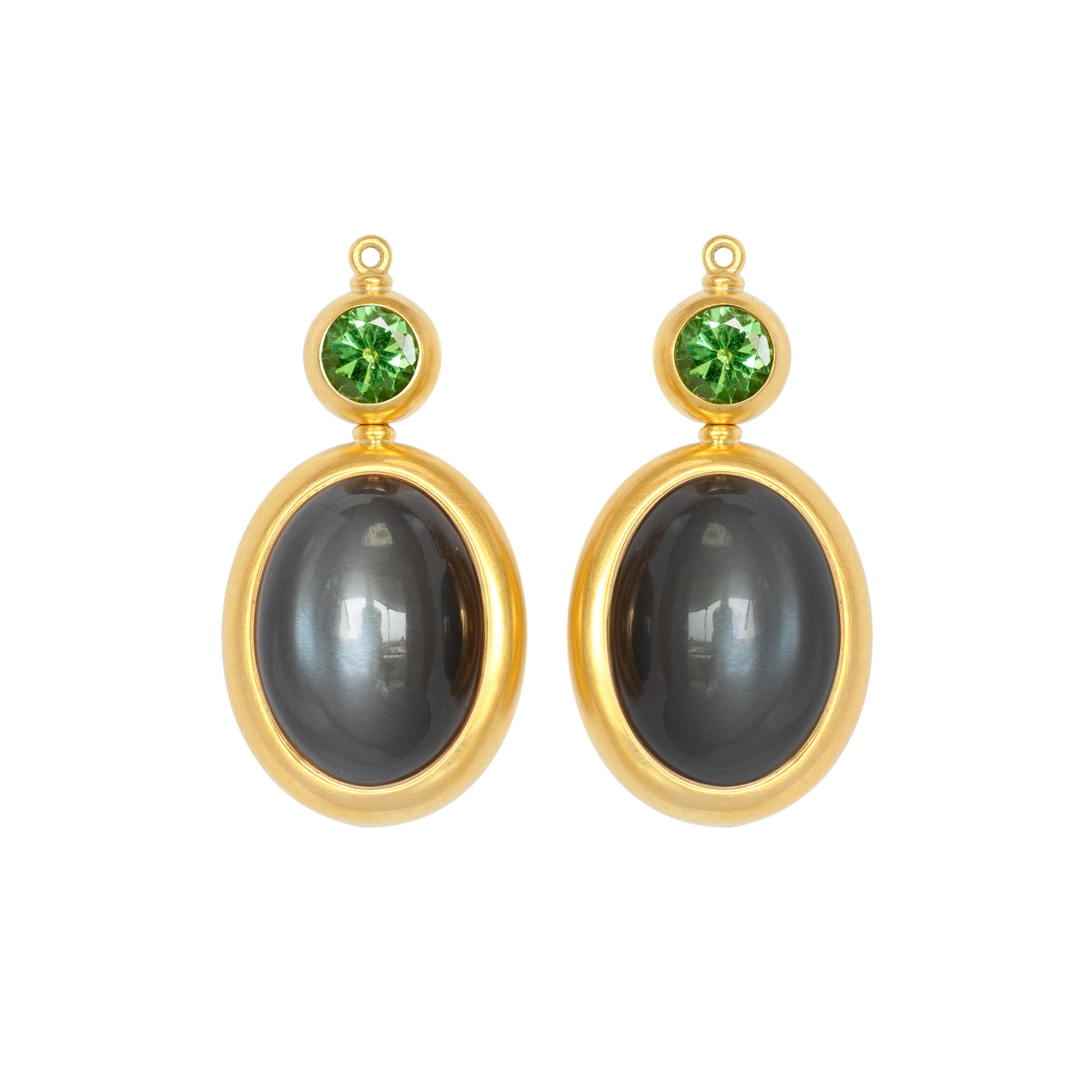 Steine: 2 Tsavorite 1,04 ct Ø 5,0 mm rund facettiert und graue Mondstein Cabochons 16 x 12 mm