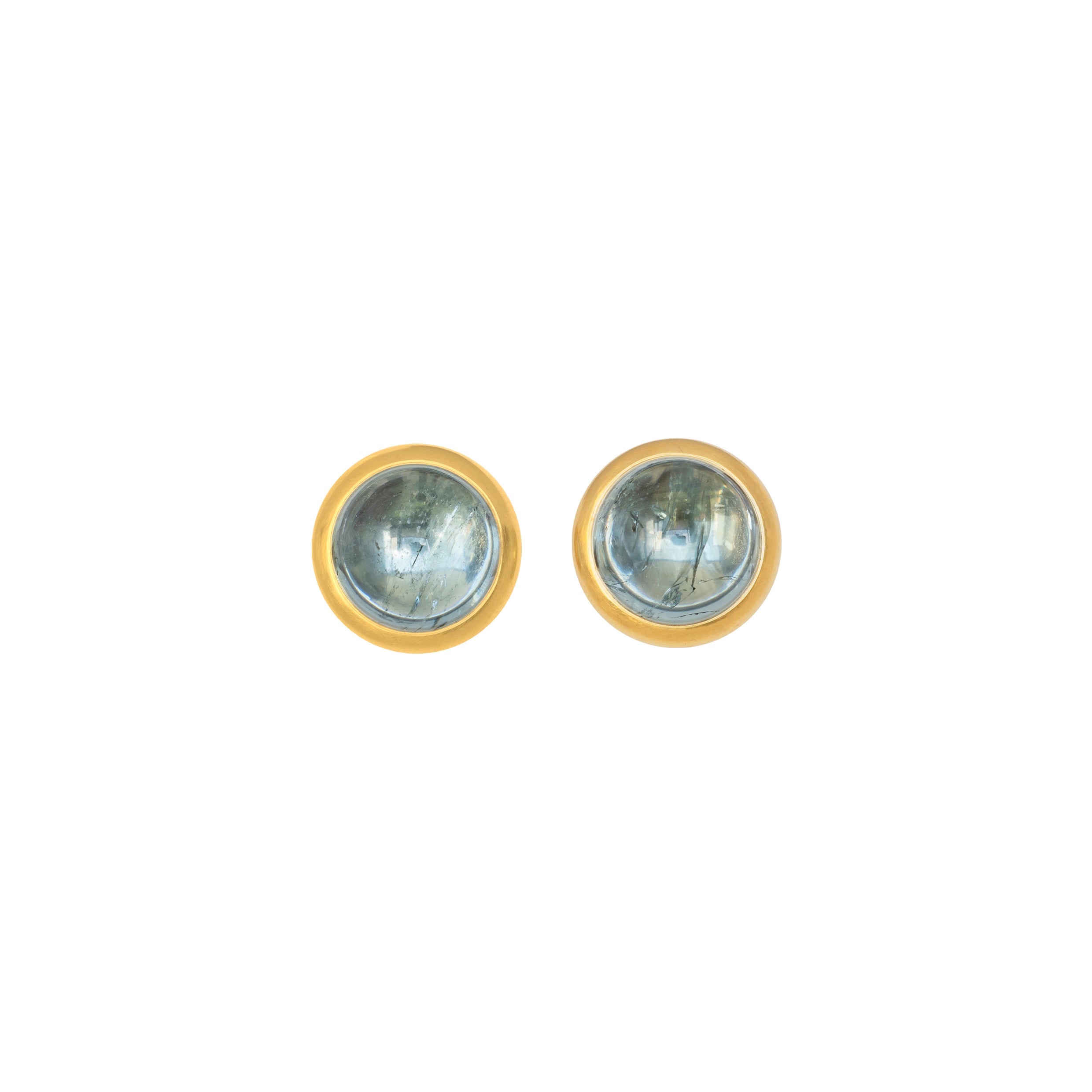 Leuchtende Aquamarincabochons, umrandet von einer geschmeidigen Goldfassung. Diese Ohrstecker sind alleine getragen, oder in Kombination