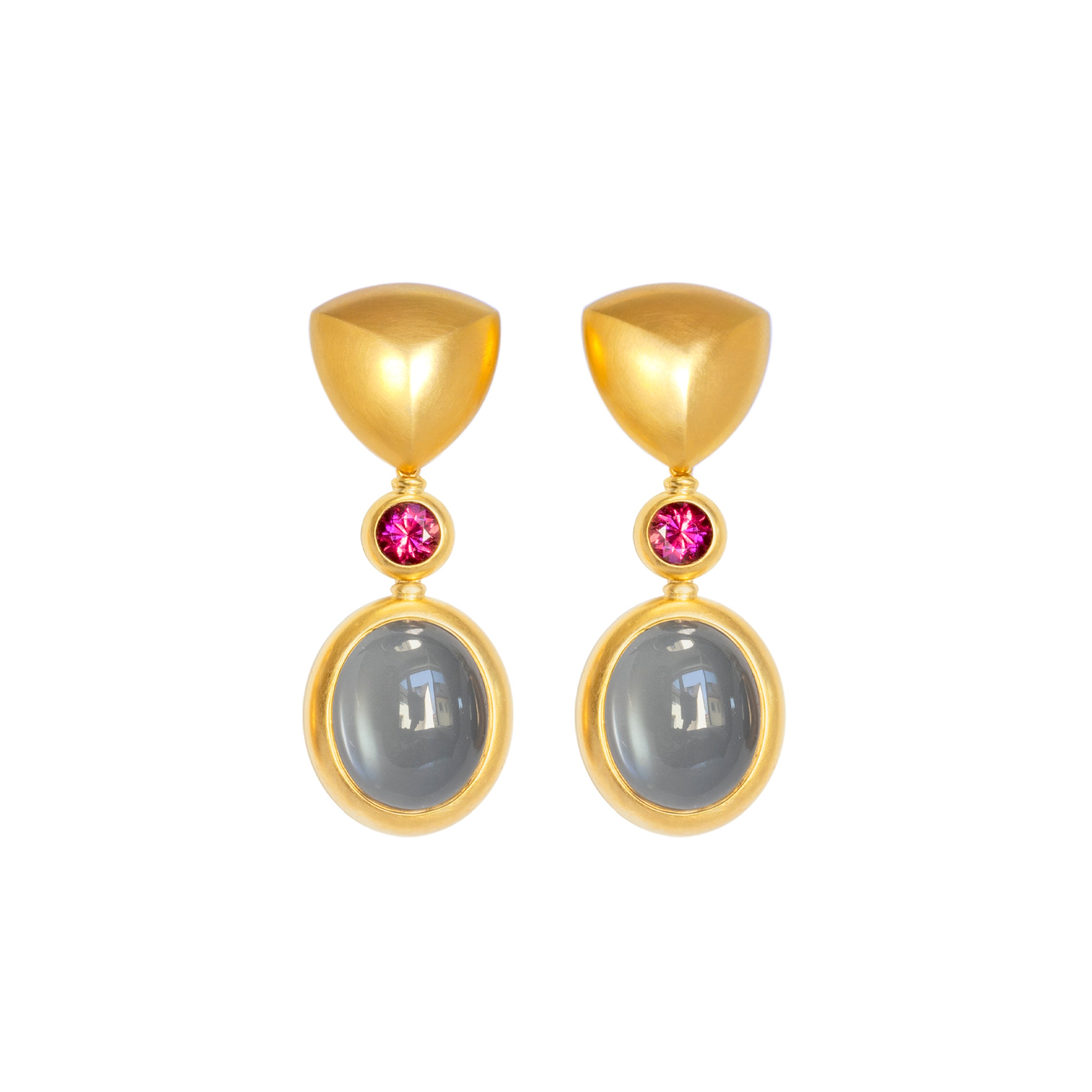 Die schlichten Oberteile in ihrer dreieckigen Form setzen die Einhänger mit den anthrazitfarbenen Mondstein Cabochons und den lebhaften Rubelliten im Brillantschliff in den Mittelpunkt.