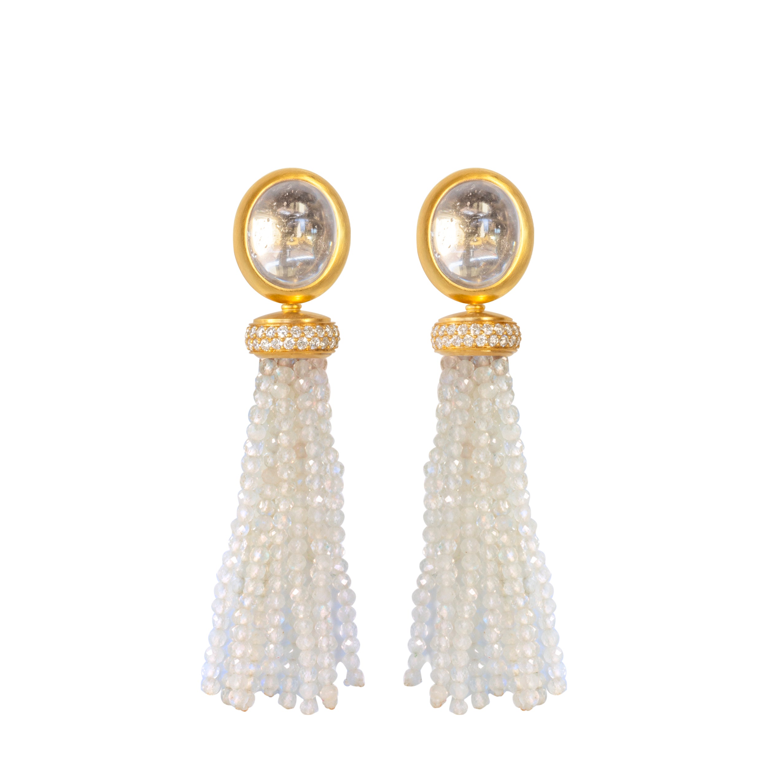 der Frische der weißen Labradorit – Quasten in den mit Brillanten gefassten Goldkappen.