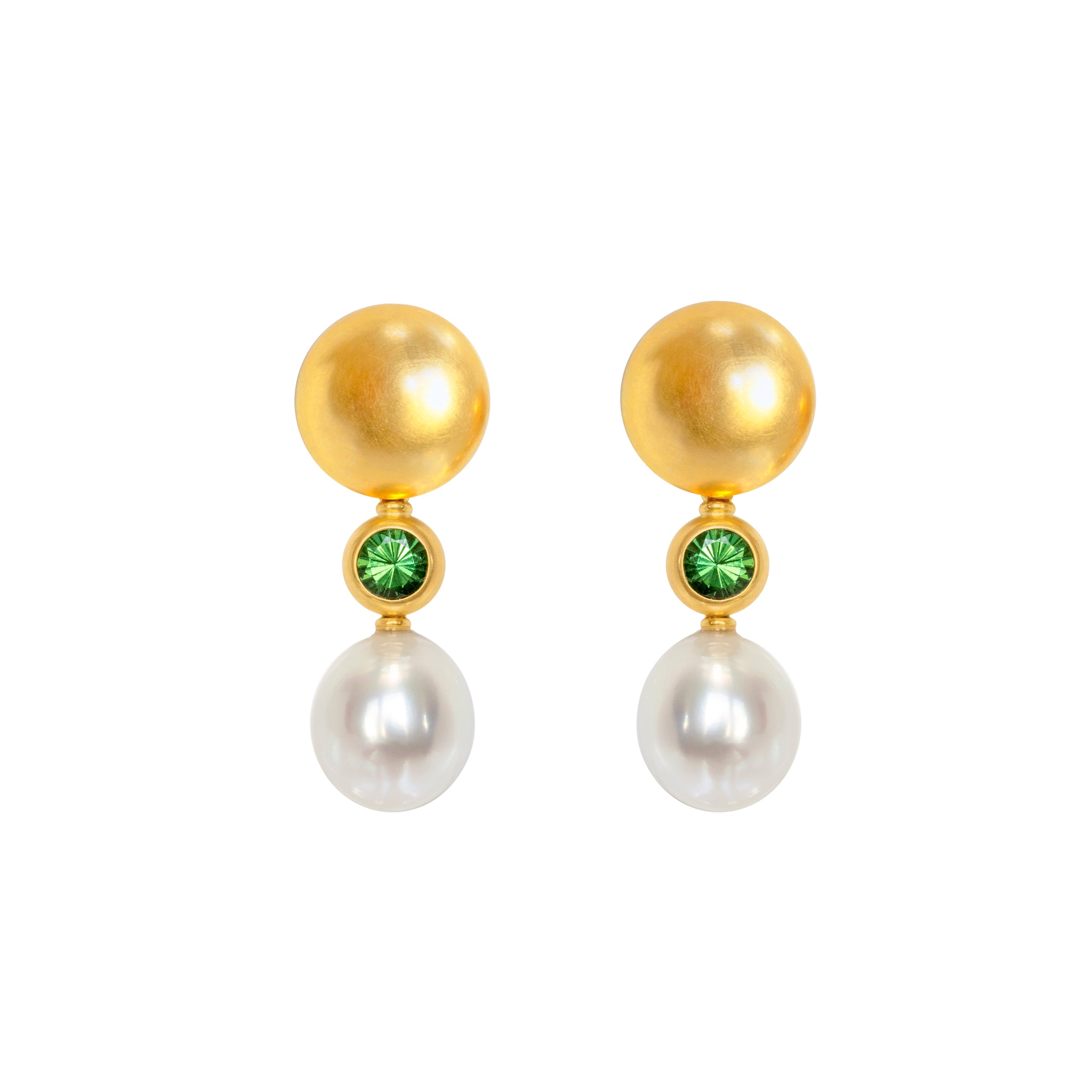 Die Einhänger mit den frischen grünen Tsavoriten und den Südseeperlen verführen die dezenten Oberteile zum großen Auftritt.