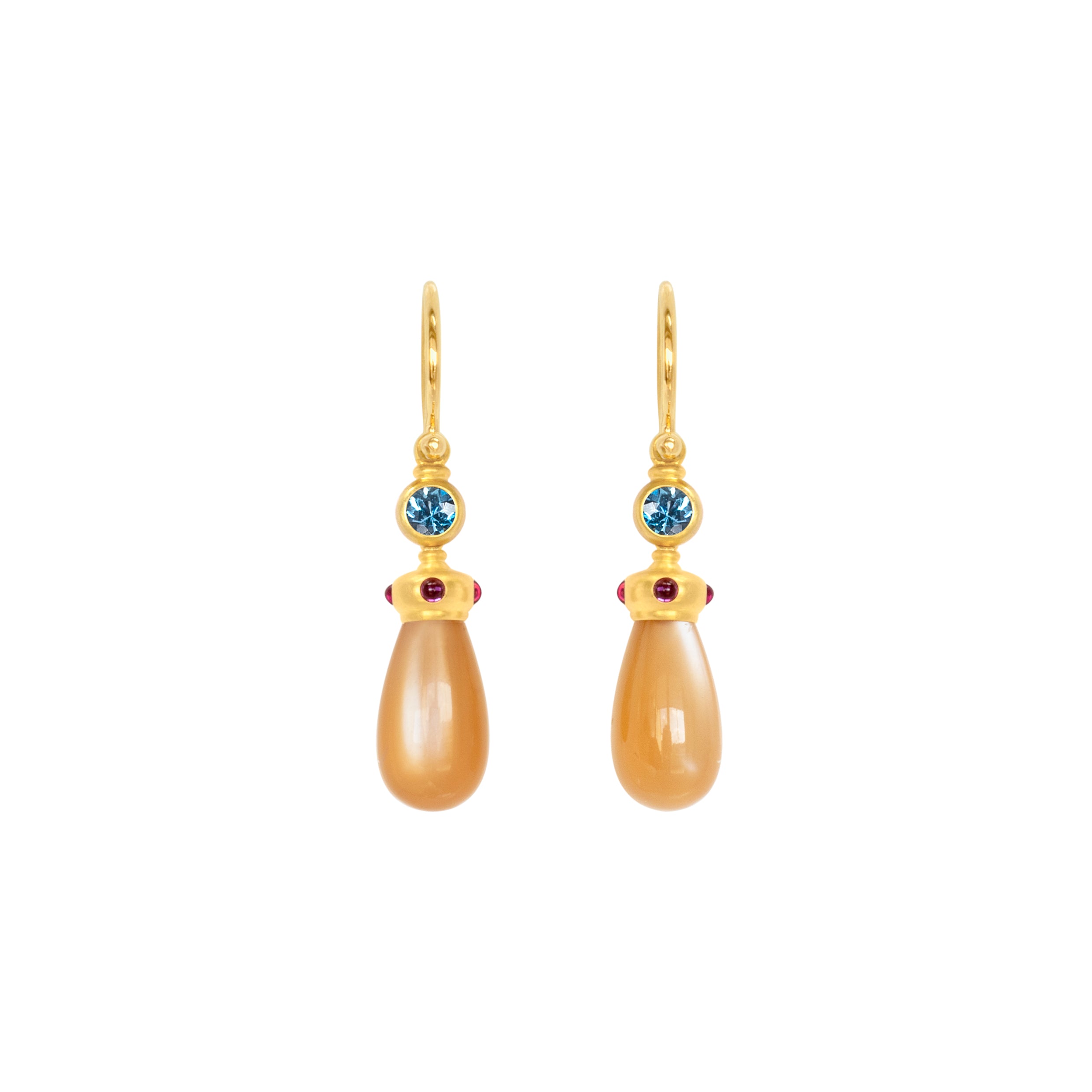 Diese Ohrhänger bestechen mit königsblauen Saphiren und zarten orangen Mondstein Pampeln, die in einer Krone mit 8 pinken Saphir Cabochons gefasst sind.