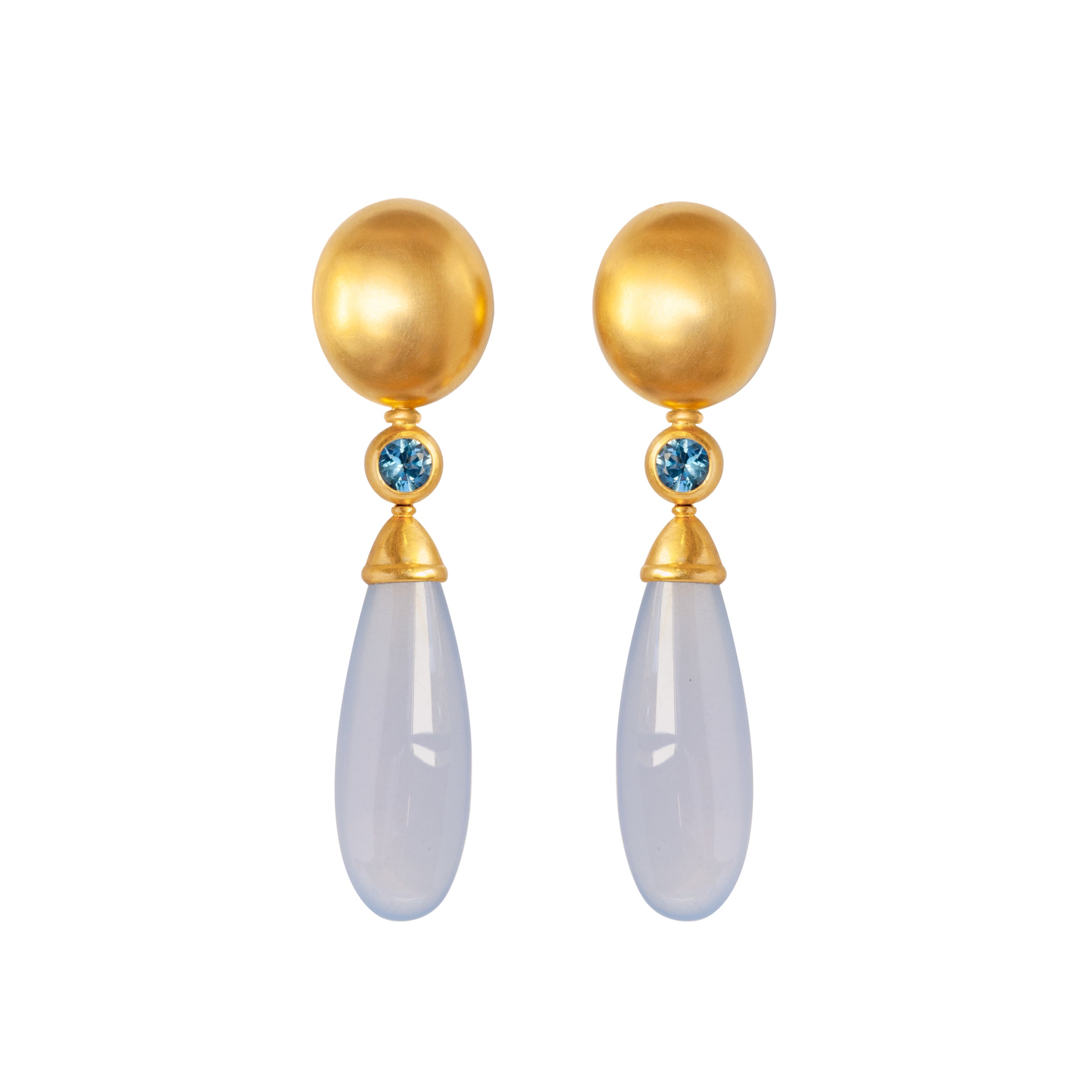 Die ovale, gewölbte Form verleiht den puristischen Oberteilen ihre Raffinesse. Die langen, schlanken Einhänger mit Aquamarinen und zartblauen Calcedonpampeln runden dieses Bild ab.
