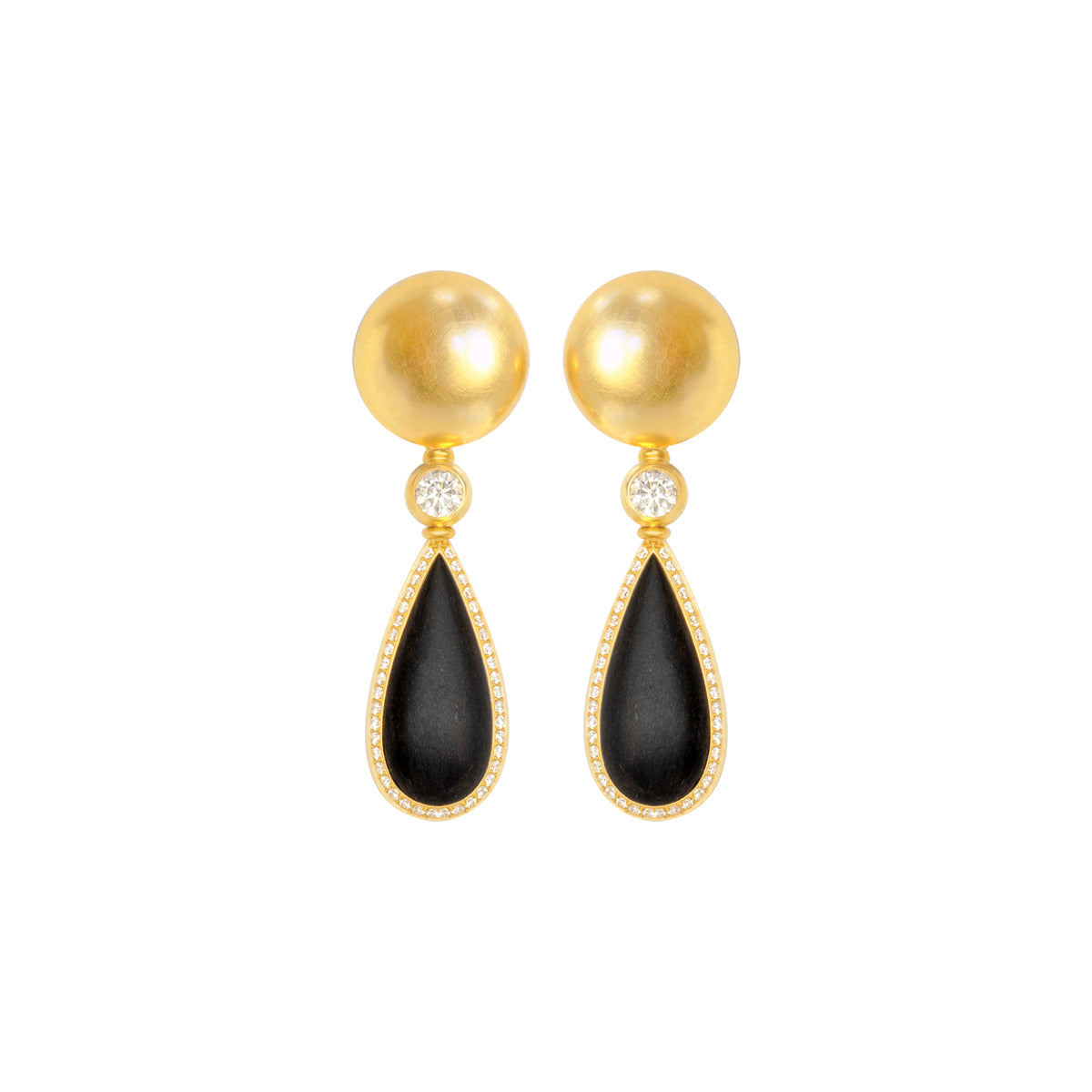 Die schlichten, pur goldenen Oberteile sind eine imposante Ergänzung zu den üppigen Einhängern. Die Brillanten im Mittelteil glänzen als Übergang zu den eher schlichten Ebenholztropfen, die von einem zarten Band aus Brillanten umrahmt sind.