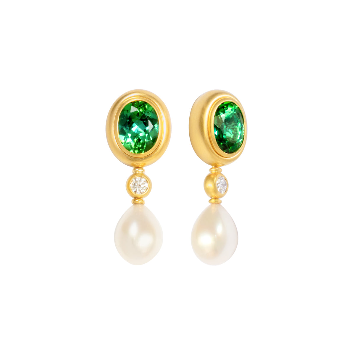 Diese Variante kombiniert feine grüne Turmaline im Facettenschliff mit Brillanten und Perltropfen, die Eleganz und Frische in einem ansprechenden Design vereinen.