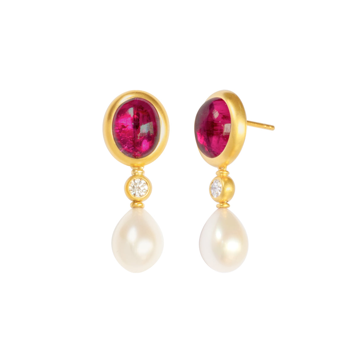Diese Variante kombiniert leuchtend rote Rubellite mit Brillanten und Perltropfen, die Eleganz und Frische in einem ansprechenden Design vereinen.